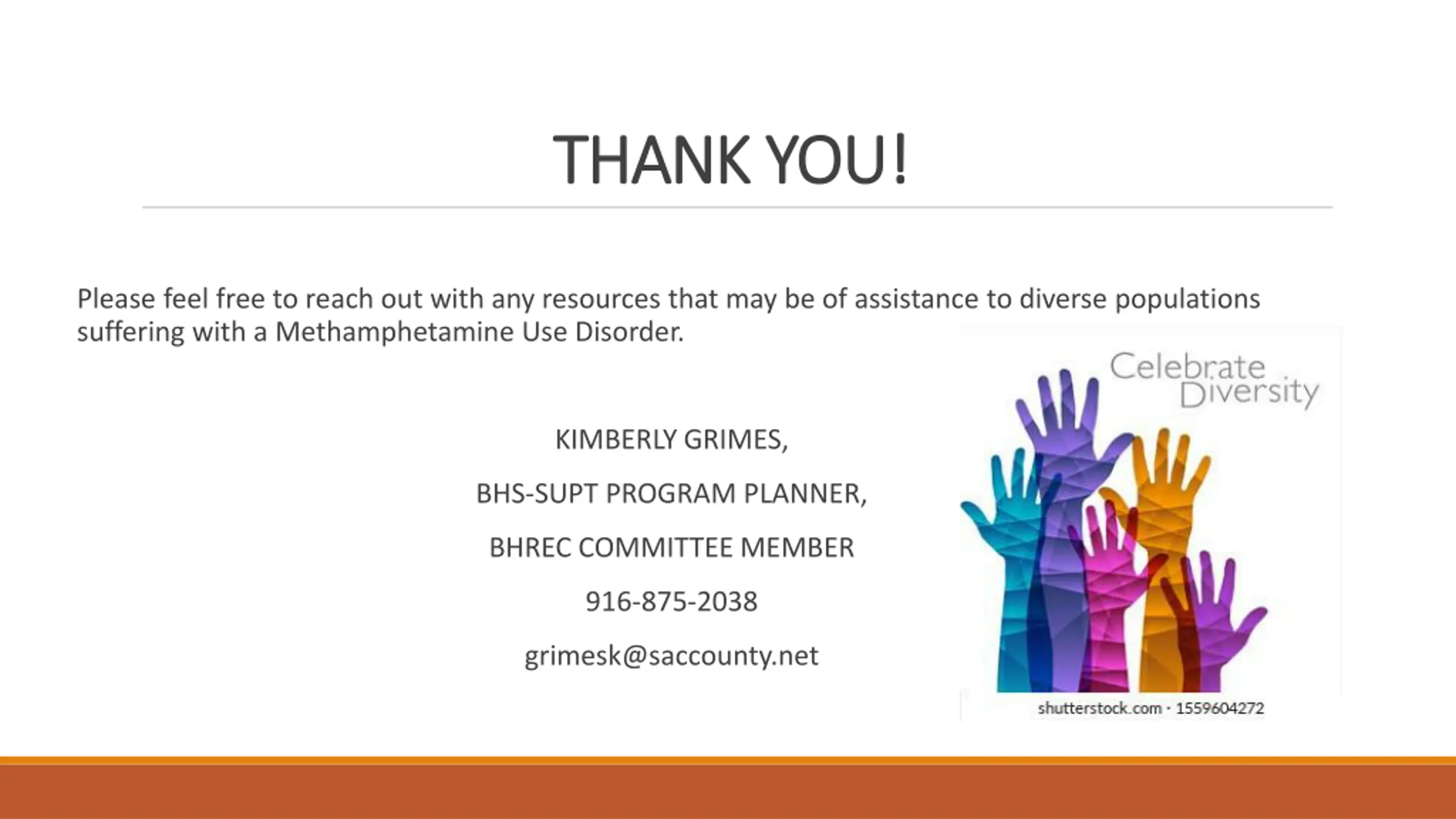 THANK YOU! THANK YOU! Please feel free to reach out with any resources that may be of assistance to diverse populations suffering with a Methamphetamine Use Disorder. KIMBERLY GRIMES, BHS-SUPT PROGRAM PLANNER, BHREC COMMITTEE MEMBER 916-875-2038 grimesk@saccounty.net