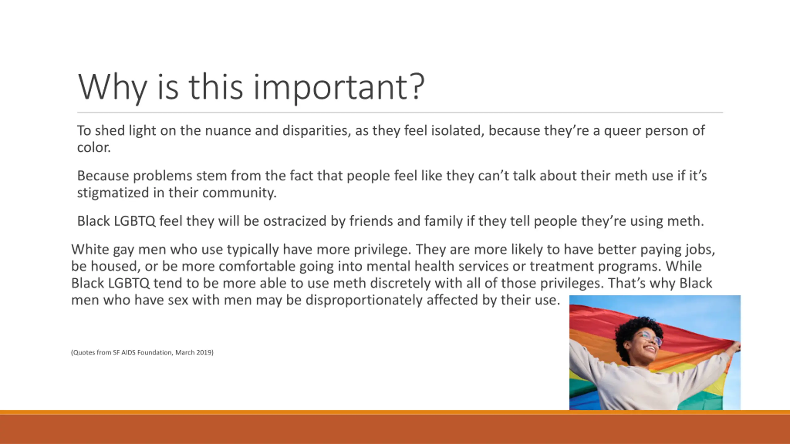 Why is this important? To shed light on the nuance and disparities, as they feel isolated, because they re a queer person of color. Because problems stem from the fact that people feel like they can t talk about their meth use if it s stigmatized in their community. Black LGBTQ feel they will be ostracized by friends and family if they tell people they re using meth. White gay men who use typically have more privilege. They are more likely to have better paying jobs, be housed, or be more comfortable going into mental health services or treatment programs. While Black LGBTQ tend to be more able to use meth discretely with all of those privileges. That s why Black men who have sex with men may be disproportionately affected by their use. (Quotes from SF AIDS Foundation, March 2019)