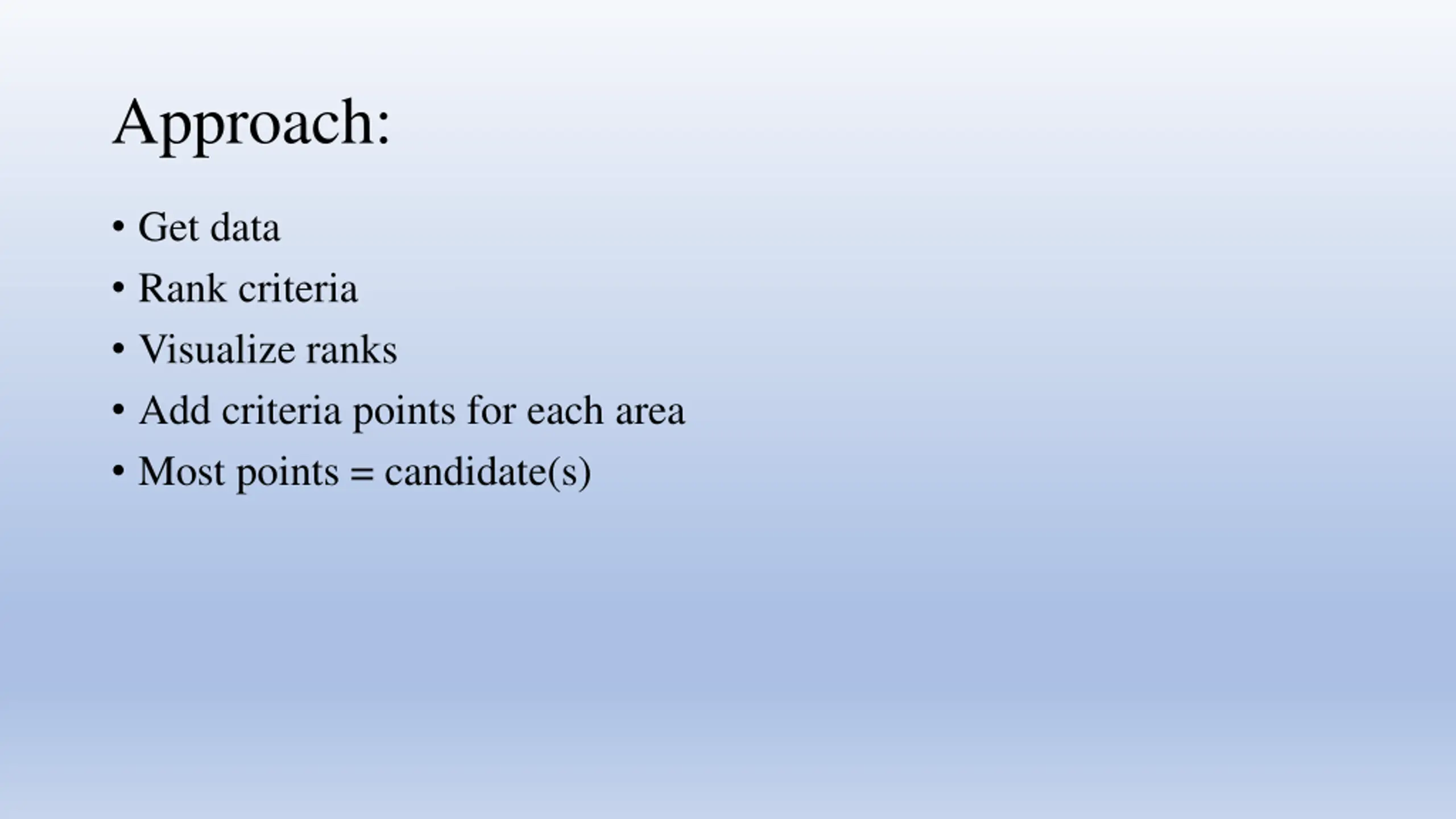 Approach: Get data Rank criteria Visualize ranks Add criteria points for each area Most points = candidate(s)