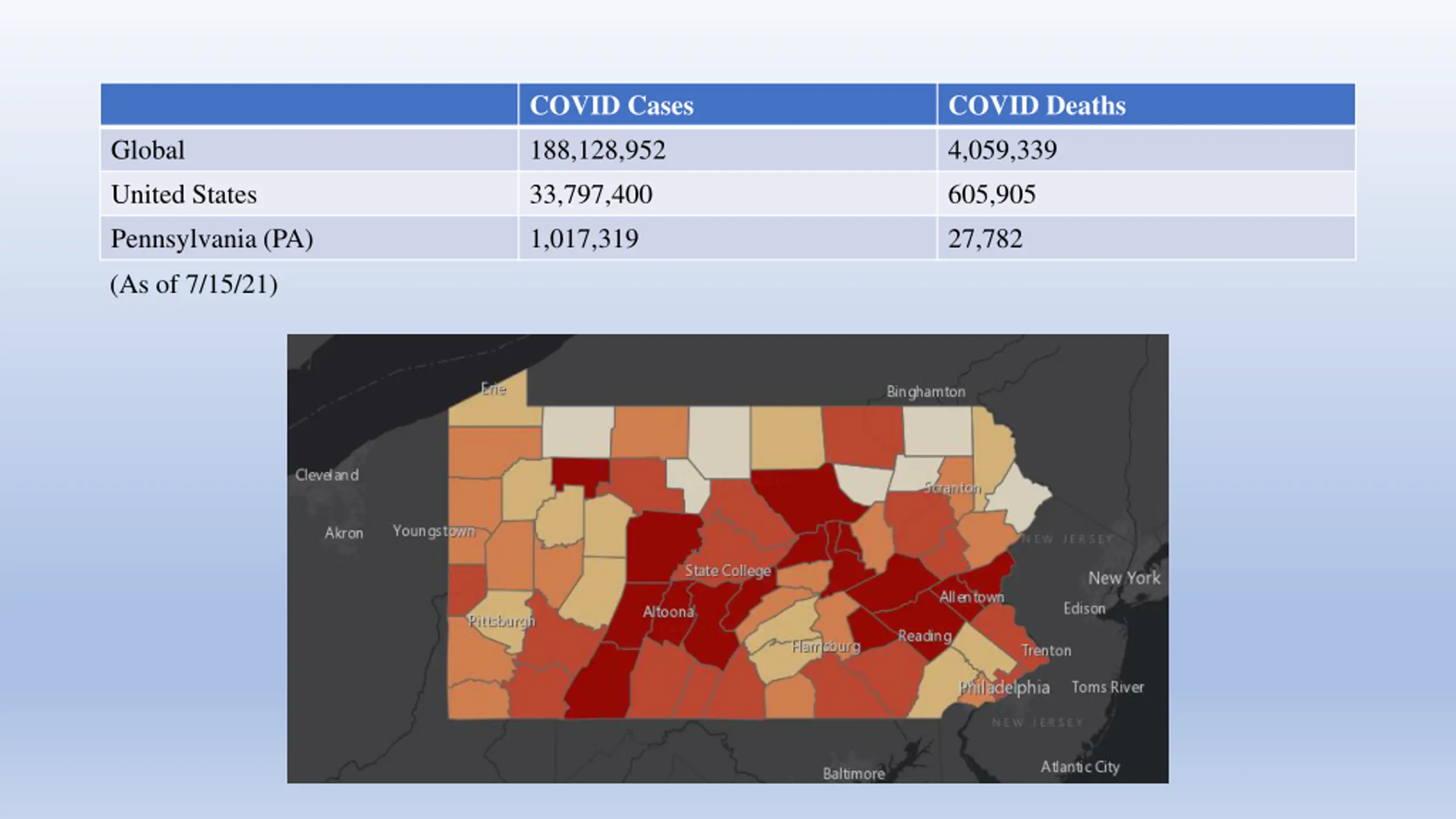 COVID Cases 188,128,952 33,797,400 1,017,319 COVID Deaths 4,059,339 605,905 27,782 Global United States Pennsylvania (PA) (As of 7/15/21)