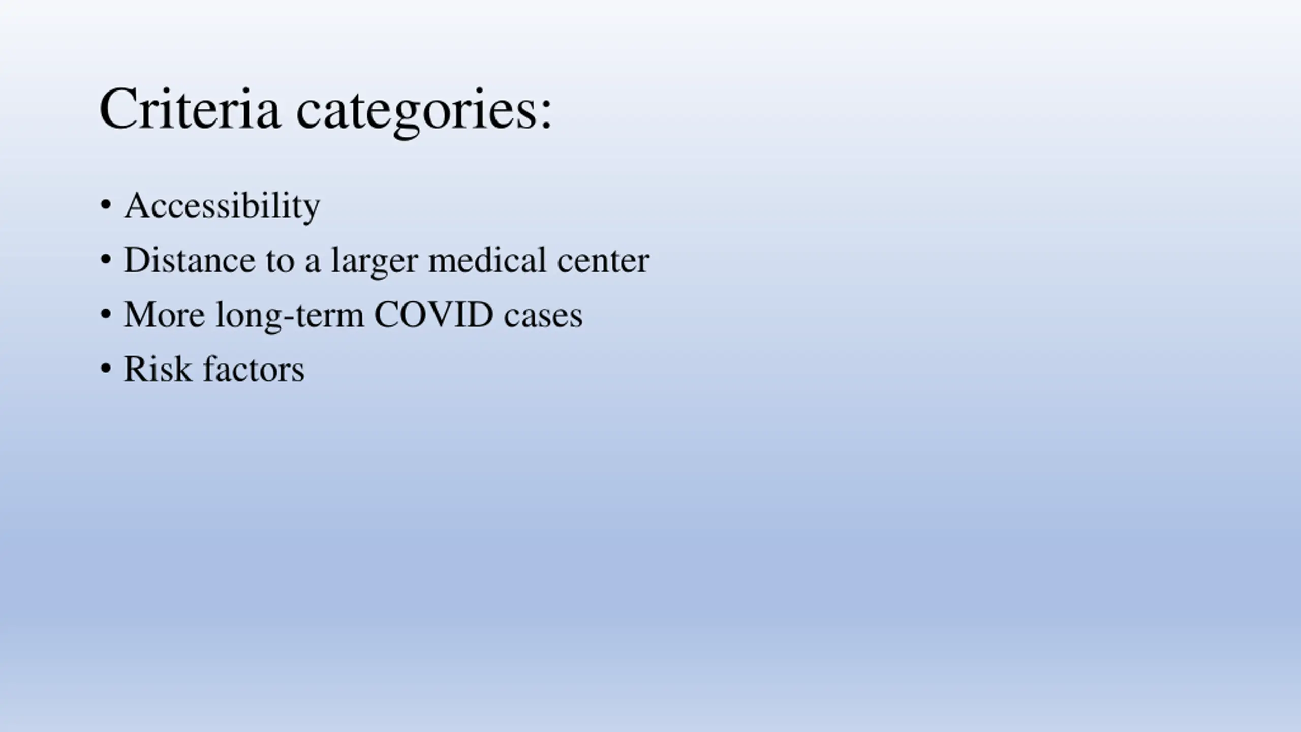 Criteria categories: Accessibility Distance to a larger medical center More long-term COVID cases Risk factors