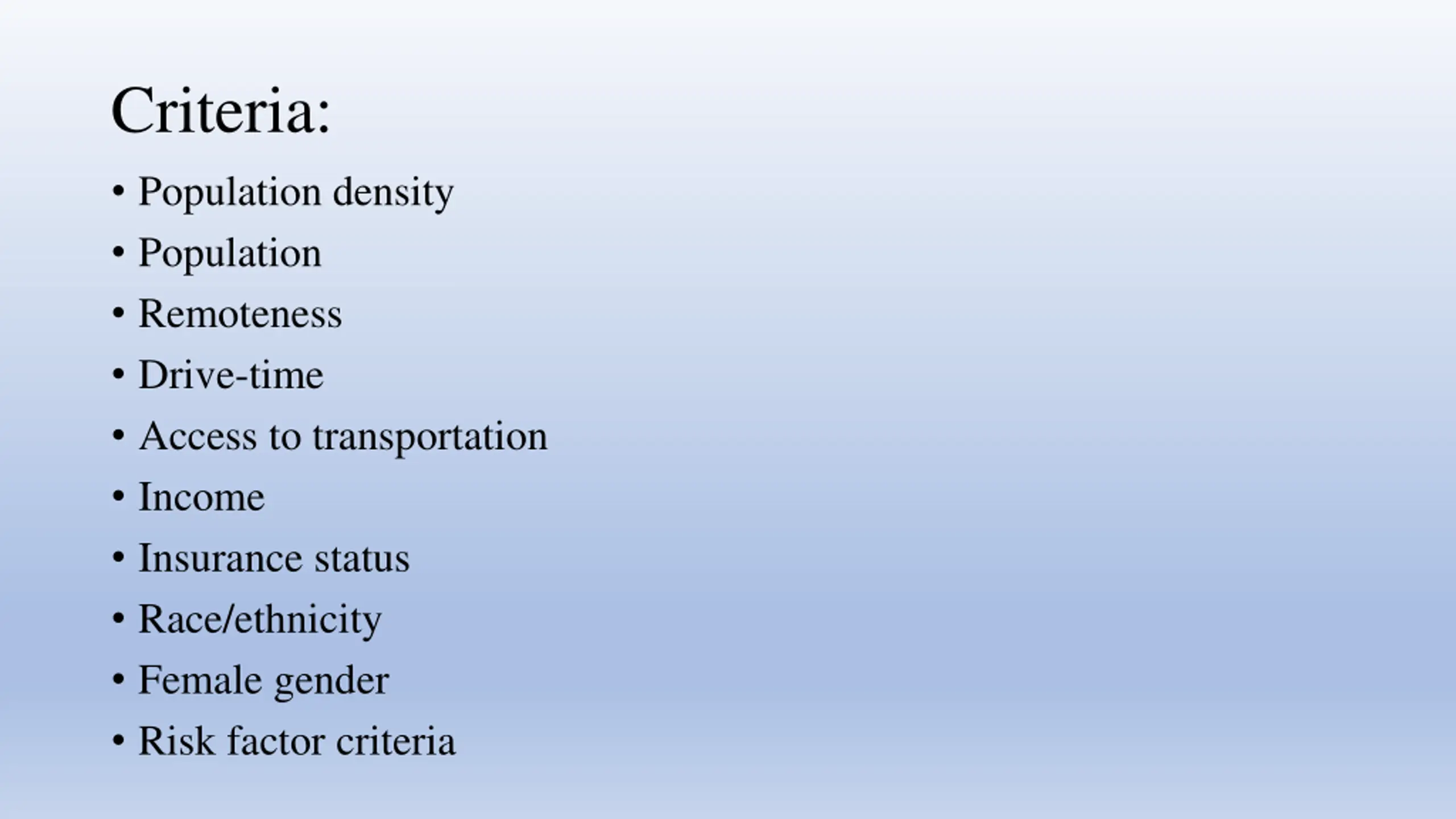 Criteria: Population density Population Remoteness Drive-time Access to transportation Income Insurance status Race/ethnicity Female gender Risk factor criteria