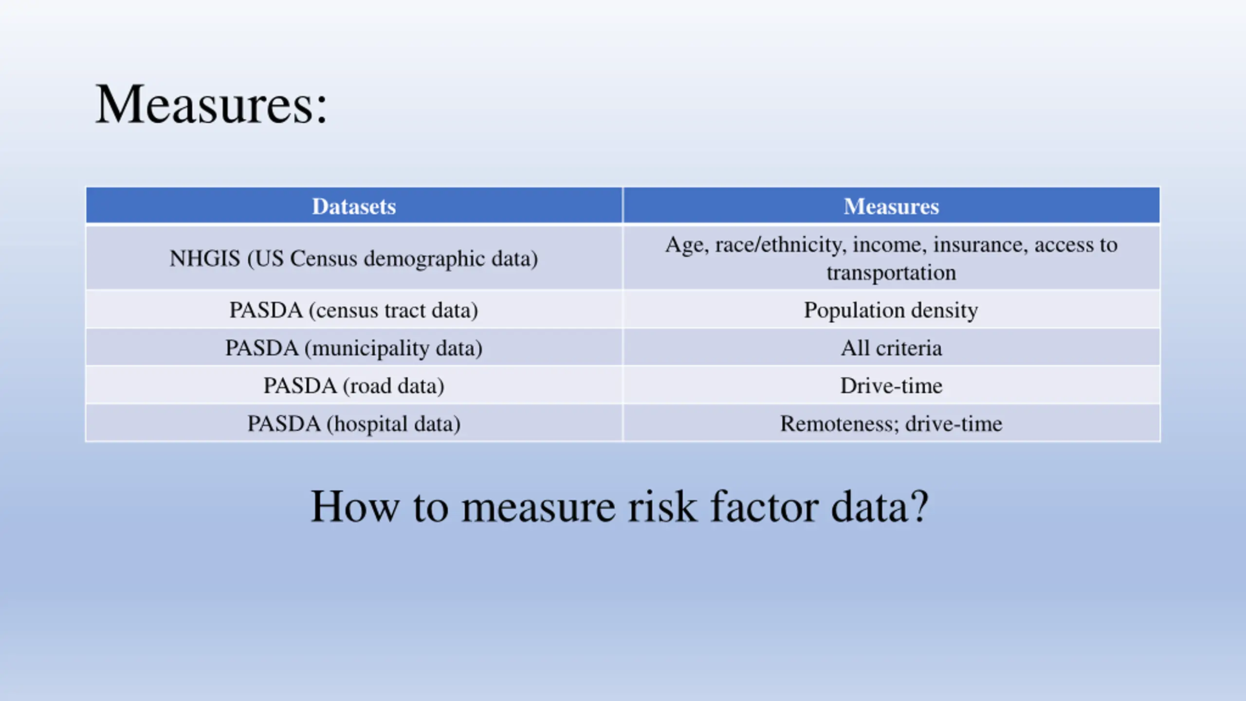 Measures: Datasets Measures Age, race/ethnicity, income, insurance, access to transportation Population density All criteria Drive-time Remoteness; drive-time NHGIS (US Census demographic data) PASDA (census tract data) PASDA (municipality data) PASDA (road data) PASDA (hospital data) How to measure risk factor data?