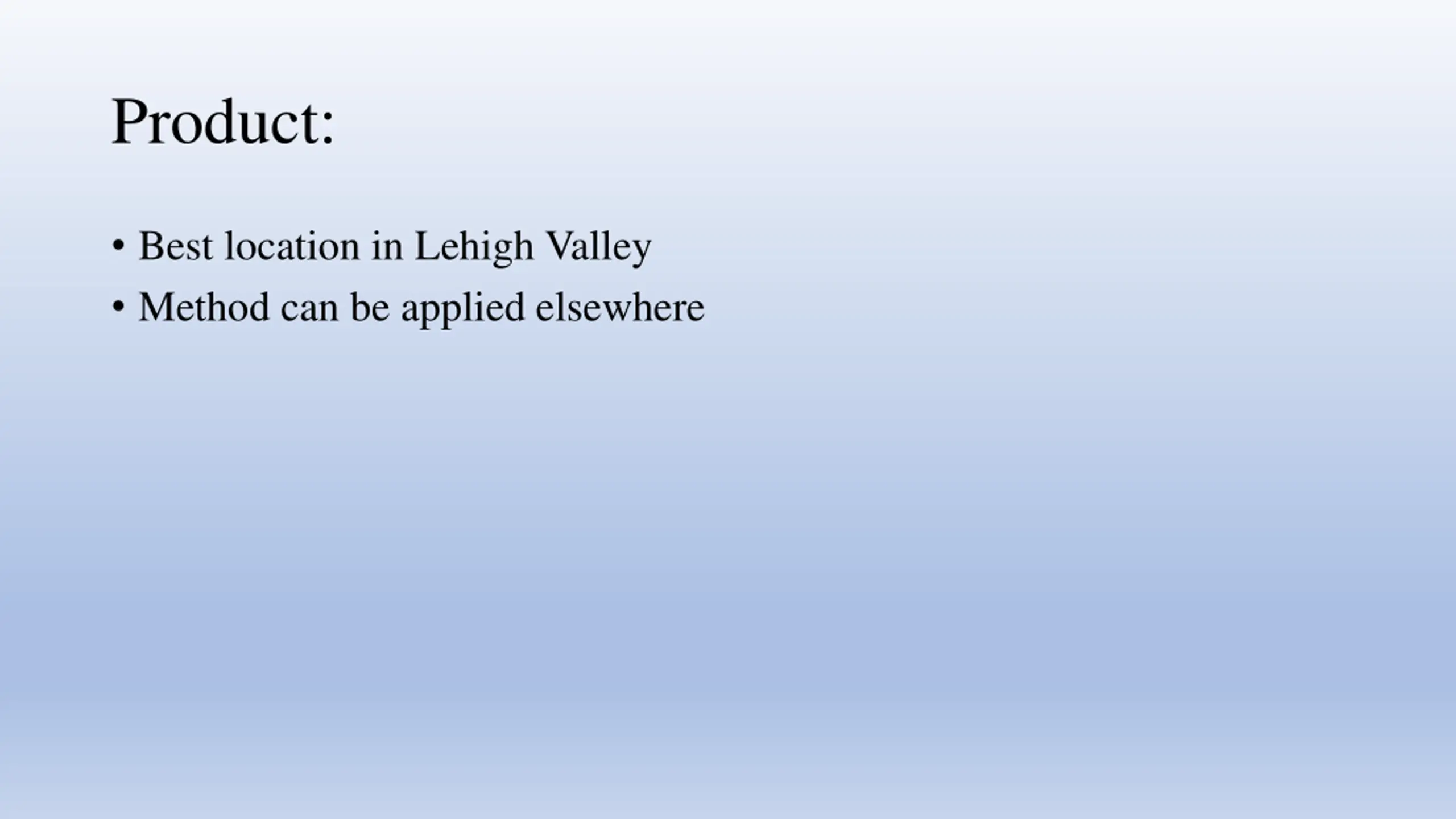 Product: Best location in Lehigh Valley Method can be applied elsewhere