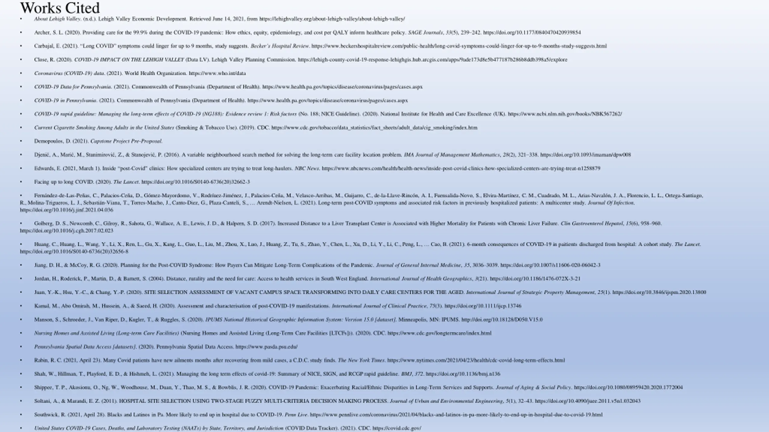 Works Cited About Lehigh Valley. (n.d.). Lehigh Valley Economic Development. Retrieved June 14, 2021, from https://lehighvalley.org/about-lehigh-valley/about-lehigh-valley/ Archer, S. L. (2020). Providing care for the 99.9% during the COVID-19 pandemic: How ethics, equity, epidemiology, and cost per QALY inform healthcare policy. SAGE Journals, 33(5), 239 242. https://doi.org/10.1177/0840470420939854 Carbajal, E. (2021). Long COVID symptoms could linger for up to 9 months, study suggests. Becker s Hospital Review. https://www.beckershospitalreview.com/public-health/long-covid-symptoms-could-linger-for-up-to-9-months-study-suggests.html Close, R. (2020). COVID-19 IMPACT ON THE LEHIGH VALLEY (Data LV). Lehigh Valley Planning Commission. https://lehigh-county-covid-19-response-lehighgis.hub.arcgis.com/apps/9ade173d8e5b477187b286b8ddb398a5/explore Coronavirus (COVID-19) data. (2021). World Health Organization. https://www.who.int/data COVID-19 Data for Pennsylvania. (2021). Commonwealth of Pennsylvania (Department of Health). https://www.health.pa.gov/topics/disease/coronavirus/pages/cases.aspx COVID-19 in Pennsylvania. (2021). Commonwealth of Pennsylvania (Department of Health). https://www.health.pa.gov/topics/disease/coronavirus/pages/cases.aspx COVID-19 rapid guideline: Managing the long-term effects of COVID-19 (NG188): Evidence review 1: Risk factors (No. 188; NICE Guideline). (2020). National Institute for Health and Care Excellence (UK). https://www.ncbi.nlm.nih.gov/books/NBK567262/ Current Cigarette Smoking Among Adults in the United States (Smoking & Tobacco Use). (2019). CDC. https://www.cdc.gov/tobacco/data_statistics/fact_sheets/adult_data/cig_smoking/index.htm Demopoulos, D. (2021). Capstone Project Pre-Proposal. Djeni , A., Mari , M., Stanimirovi , Z., & Stanojevi , P. (2016). A variable neighbourhood search method for solving the long-term care facility location problem. IMA Journal of Management Mathematics, 28(2), 321 338. https://doi.org/10.1093/imaman/dpw008 Edwards, E. (2021, March 1). Inside post-Covid clinics: How specialized centers are trying to treat long-haulers. NBC News. https://www.nbcnews.com/health/health-news/inside-post-covid-clinics-how-specialized-centers-are-trying-treat-n1258879 Facing up to long COVID. (2020). The Lancet. https://doi.org/10.1016/S0140-6736(20)32662-3 Fern ndez-de-Las-Pe as, C., Palacios-Ce a, D., G mez-Mayordomo, V., Rodr uez-Jim nez, J., Palacios-Ce a, M., Velasco-Arribas, M., Guijarro, C., de-la-Llave-Rinc n, A. I., Fuensalida-Novo, S., Elvira-Mart nez, C. M., Cuadrado, M. L., Arias-Naval n, J. A., Florencio, L. L., Ortega-Santiago, R., Molina-Trigueros, L. J., Sebasti n-Viana, T., Torres-Macho, J., Canto-Diez, G., Plaza-Canteli, S., Arendt-Nielsen, L. (2021). Long-term post-COVID symptoms and associated risk factors in previously hospitalized patients: A multicenter study. Journal Of Infection. https://doi.org/10.1016/j.jinf.2021.04.036 Golberg, D. S., Newcomb, C., Gilroy, R., Sahota, G., Wallace, A. E., Lewis, J. D., & Halpern, S. D. (2017). Increased Distance to a Liver Transplant Center is Associated with Higher Mortality for Patients with Chronic Liver Failure. Clin Gastroenterol Hepatol, 15(6), 958 960. https://doi.org/10.1016/j.cgh.2017.02.023 Huang, C., Huang, L., Wang, Y., Li, X., Ren, L., Gu, X., Kang, L., Guo, L., Liu, M., Zhou, X., Luo, J., Huang, Z., Tu, S., Zhao, Y., Chen, L., Xu, D., Li, Y., Li, C., Peng, L., Cao, B. (2021). 6-month consequences of COVID-19 in paitients discharged from hospital: A cohort study. The Lancet. https://doi.org/10.1016/S0140-6736(20)32656-8 Jiang, D. H., & McCoy, R. G. (2020). Planning for the Post-COVID Syndrome: How Payers Can Mitigate Long-Term Complications of the Pandemic. Journal of General Internal Medicine, 35, 3036 3039. https://doi.org/10.1007/s11606-020-06042-3 Jordan, H., Roderick, P., Martin, D., & Barnett, S. (2004). Distance, rurality and the need for care: Access to health services in South West England. International Journal of Health Geographics, 3(21). https://doi.org/10.1186/1476-072X-3-21 Juan, Y.-K., Hsu, Y.-C., & Chang, Y.-P. (2020). SITE SELECTION ASSESSMENT OF VACANT CAMPUS SPACE TRANSFORMING INTO DAILY CARE CENTERS FOR THE AGED. International Journal of Strategic Property Management, 25(1). https://doi.org/10.3846/ijspm.2020.13800 Kamal, M., Abo Omirah, M., Hussein, A., & Saeed, H. (2020). Assessment and characterisation of post-COVID-19 manifestations. International Journal of Clinical Practice, 75(3). https://doi.org/10.1111/ijcp.13746 Manson, S., Schroeder, J., Van Riper, D., Kugler, T., & Ruggles, S. (2020). IPUMS National Historical Geographic Information System: Version 15.0 [dataset]. Minneapolis, MN: IPUMS. http://doi.org/10.18128/D050.V15.0 Nursing Homes and Assisted Living (Long-term Care Facilities) (Nursing Homes and Assisted Living (Long-Term Care Facilities [LTCFs])). (2020). CDC. https://www.cdc.gov/longtermcare/index.html Pennsylvania Spatial Data Access [datasets]. (2020). Pennsylvania Spatial Data Access. https://www.pasda.psu.edu/ Rabin, R. C. (2021, April 23). Many Covid patients have new ailments months after recovering from mild cases, a C.D.C. study finds. The New York Times. https://www.nytimes.com/2021/04/23/health/cdc-covid-long-term-effects.html Shah, W., Hillman, T., Playford, E. D., & Hishmeh, L. (2021). Managing the long term effects of covid-19: Summary of NICE, SIGN, and RCGP rapid guideline. BMJ, 372. https://doi.org/10.1136/bmj.n136 Shippee, T. P., Akosionu, O., Ng, W., Woodhouse, M., Duan, Y., Thao, M. S., & Bowblis, J. R. (2020). COVID-19 Pandemic: Exacerbating Racial/Ethnic Disparities in Long-Term Services and Supports. Journal of Aging & Social Policy. https://doi.org/10.1080/08959420.2020.1772004 Soltani, A., & Marandi, E. Z. (2011). HOSPITAL SITE SELECTION USING TWO-STAGE FUZZY MULTI-CRITERIA DECISION MAKING PROCESS. Journal of Urban and Environmental Engineering, 5(1), 32 43. https://doi.org/10.4090/juee.2011.v5n1.032043 Sout