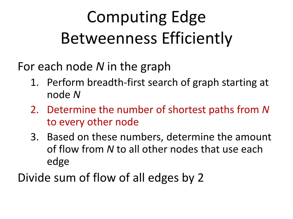 Computing Edge Betweenness Efficiently For each node N in the graph 1. Perform breadth-first search of graph starting at node N 2. Determine the number of shortest paths from N to every other node 3. Based on these numbers, determine the amount of flow from N to all other nodes that use each edge Divide sum of flow of all edges by 2