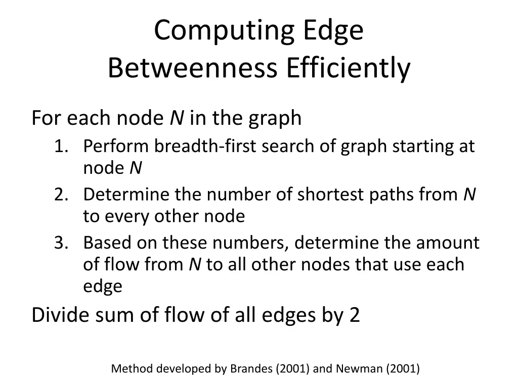 Computing Edge Betweenness Efficiently For each node N in the graph 1. Perform breadth-first search of graph starting at node N 2. Determine the number of shortest paths from N to every other node 3. Based on these numbers, determine the amount of flow from N to all other nodes that use each edge Divide sum of flow of all edges by 2 Method developed by Brandes (2001) and Newman (2001)