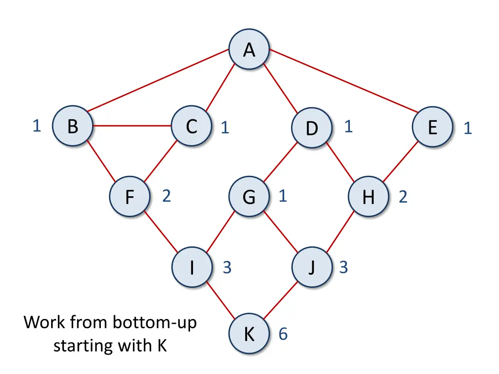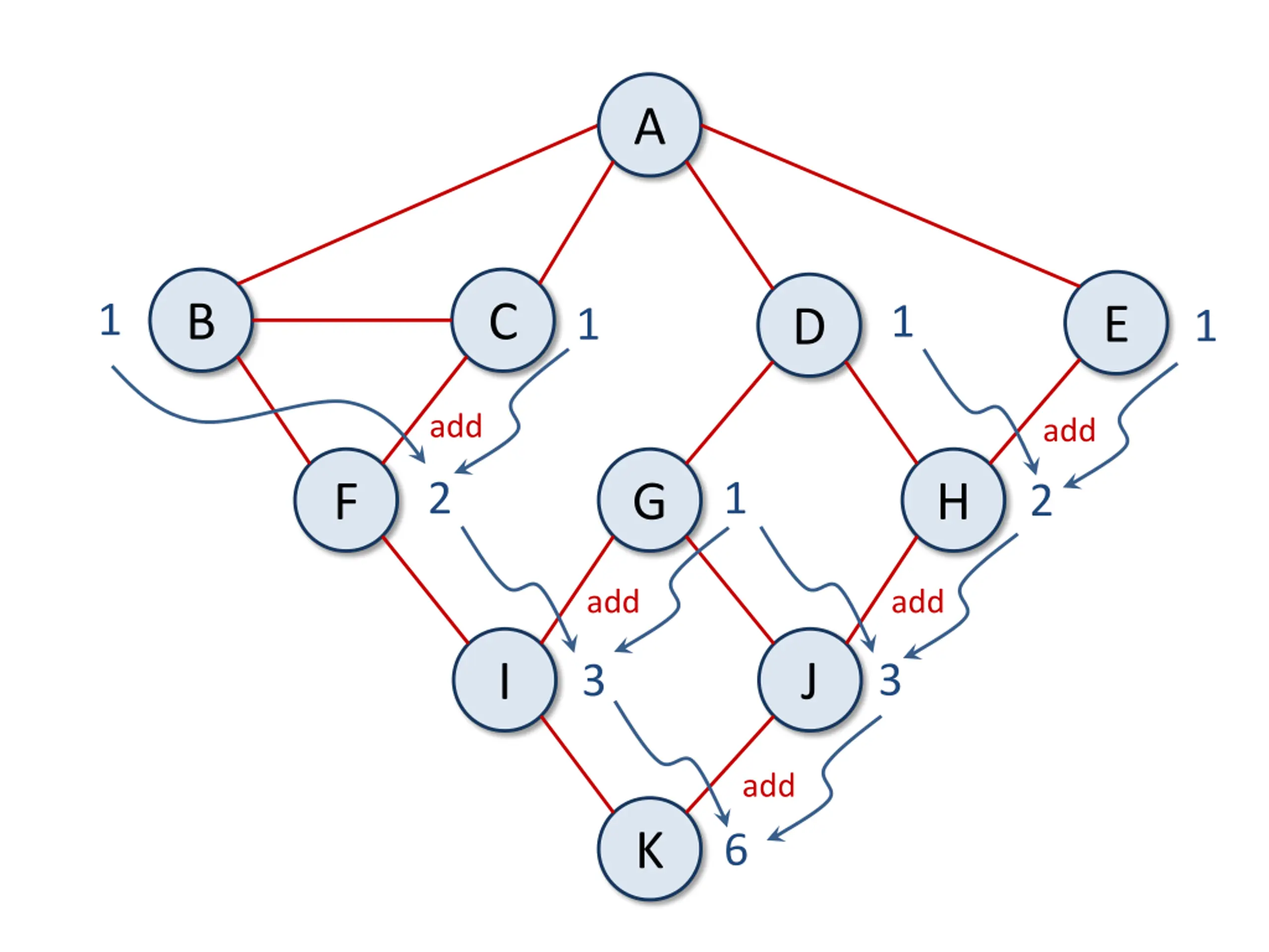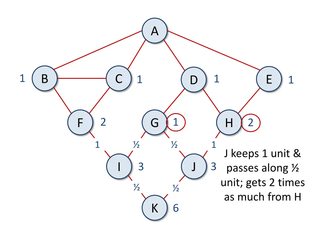 A B C 1 E 1 D 1 1 2 1 F G H 2 1 1 J keeps 1 unit & passes along unit; gets 2 times as much from H J I 3 3 K 6
