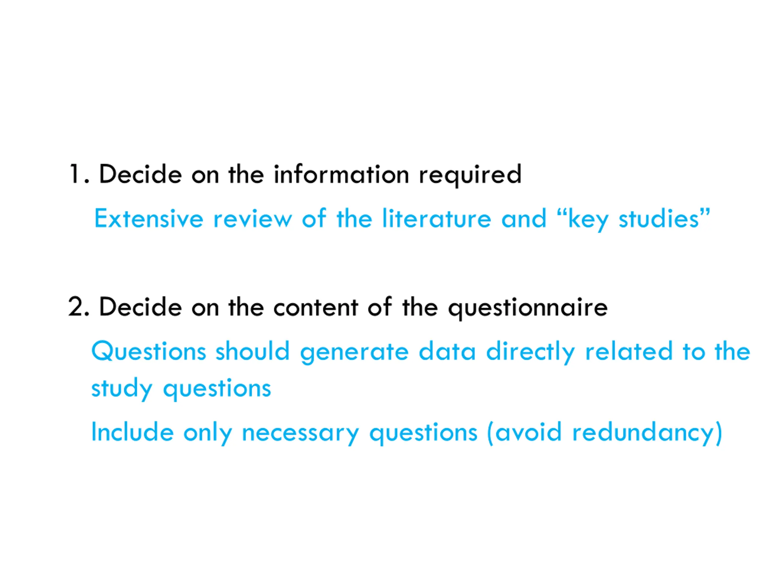 1. Decide on the information required Extensive review of the literature and key studies 2. Decide on the content of the questionnaire Questions should generate data directly related to the study questions Include only necessary questions (avoid redundancy)