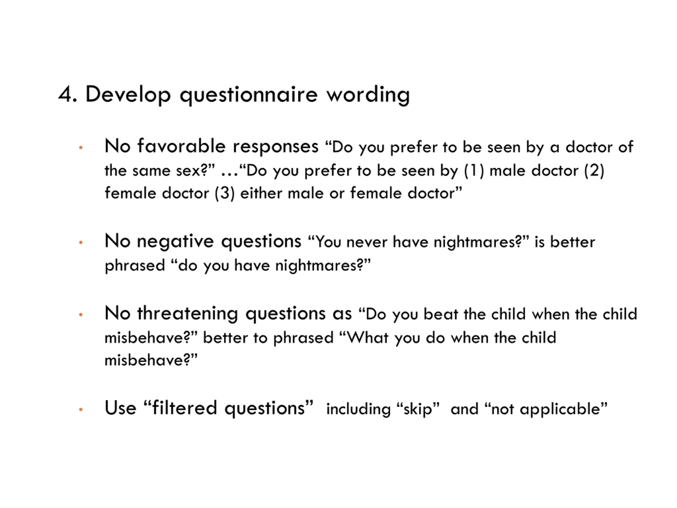 4. Develop questionnaire wording No favorable responses Do you prefer to be seen by a doctor of the same sex? Do you prefer to be seen by (1) male doctor (2) female doctor (3) either male or female doctor No negative questions You never have nightmares? is better phrased do you have nightmares? No threatening questions as Do you beat the child when the child misbehave? better to phrased What you do when the child misbehave? Use filtered questions including skip and not applicable