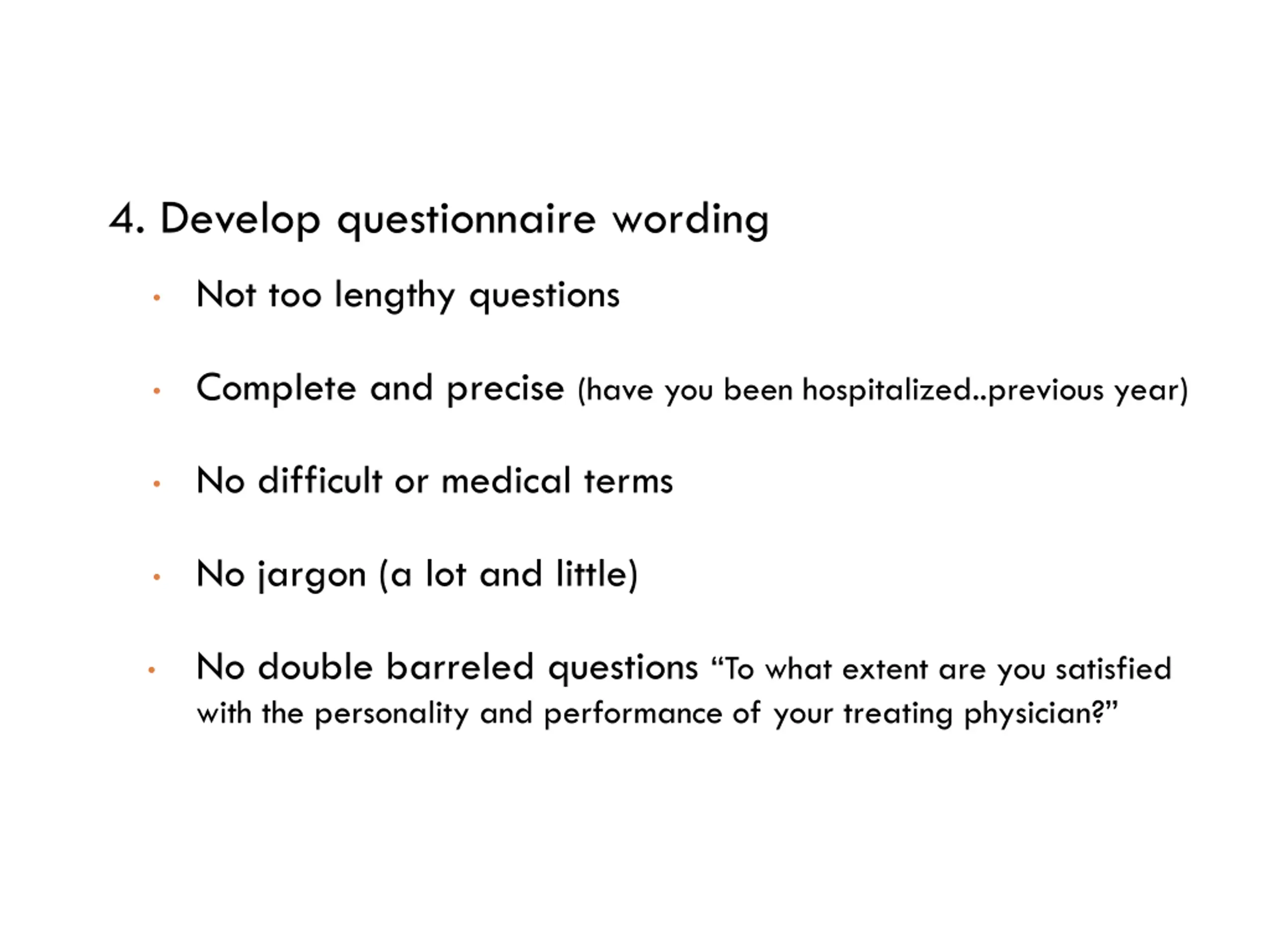 4. Develop questionnaire wording Not too lengthy questions Complete and precise (have you been hospitalized..previous year) No difficult or medical terms No jargon (a lot and little) No double barreled questions To what extent are you satisfied with the personality and performance of your treating physician?