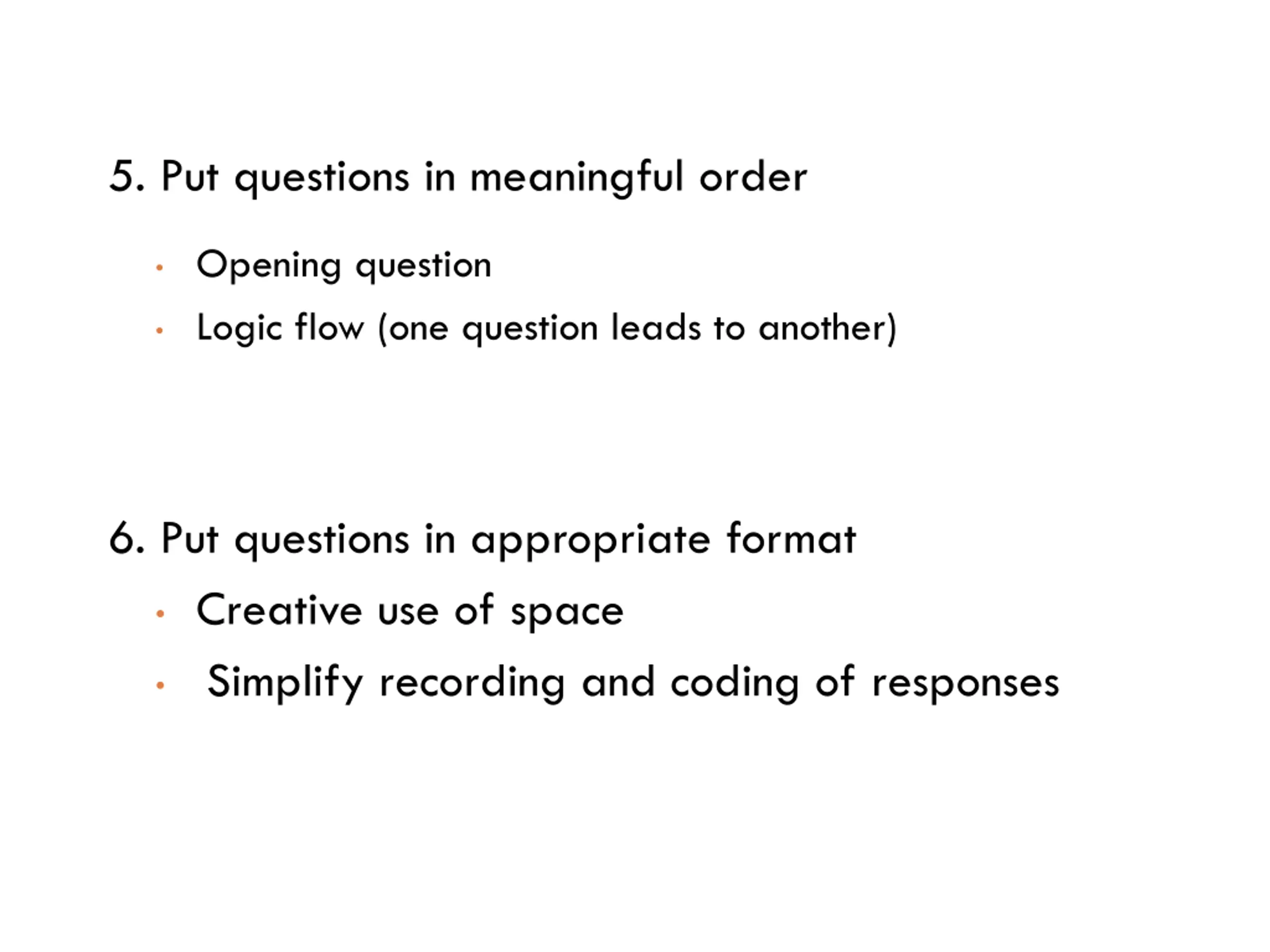 5. Put questions in meaningful order Opening question Logic flow (one question leads to another) 6. Put questions in appropriate format Creative use of space Simplify recording and coding of responses