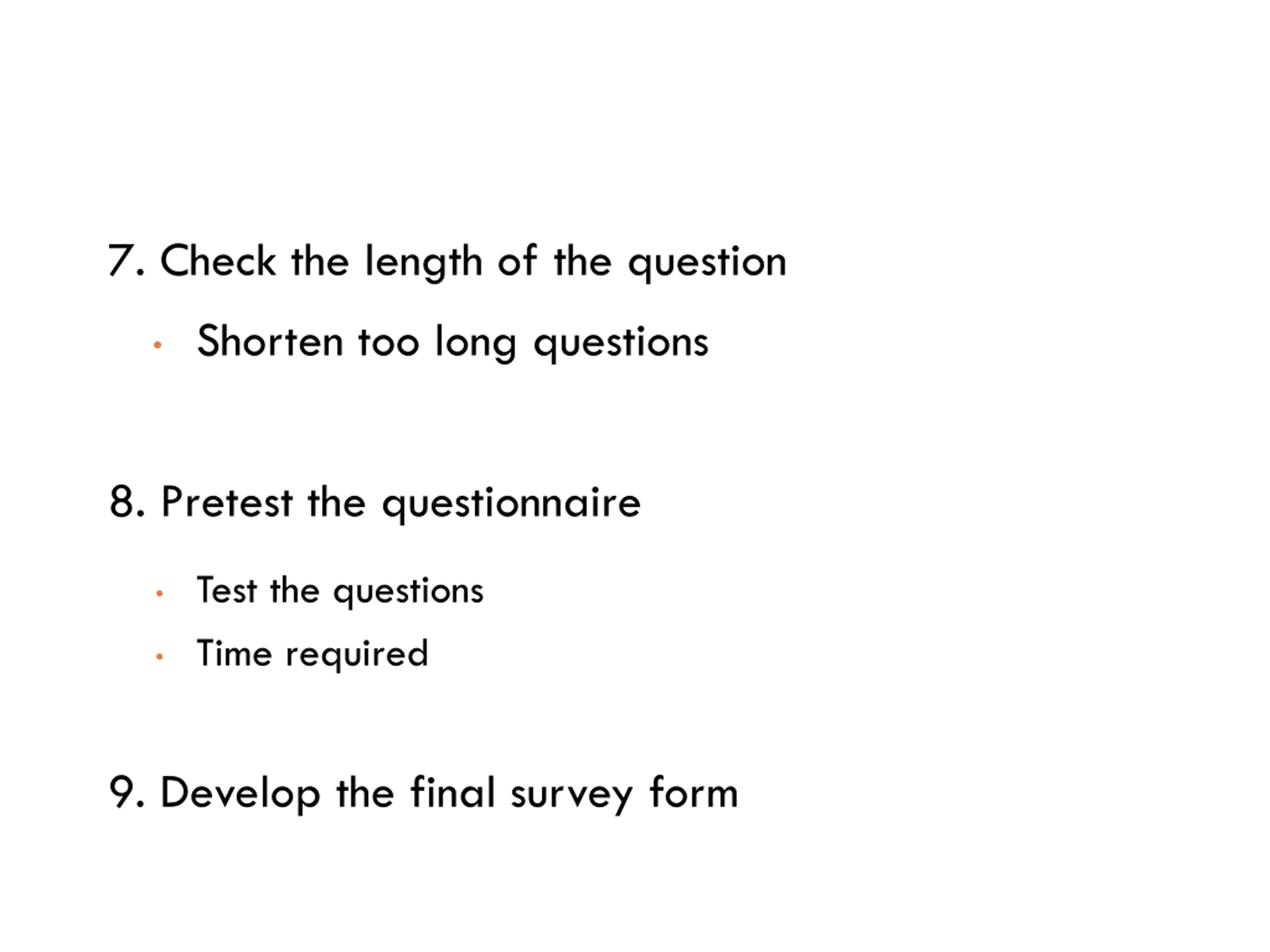 7. Check the length of the question Shorten too long questions 8. Pretest the questionnaire Test the questions Time required 9. Develop the final survey form
