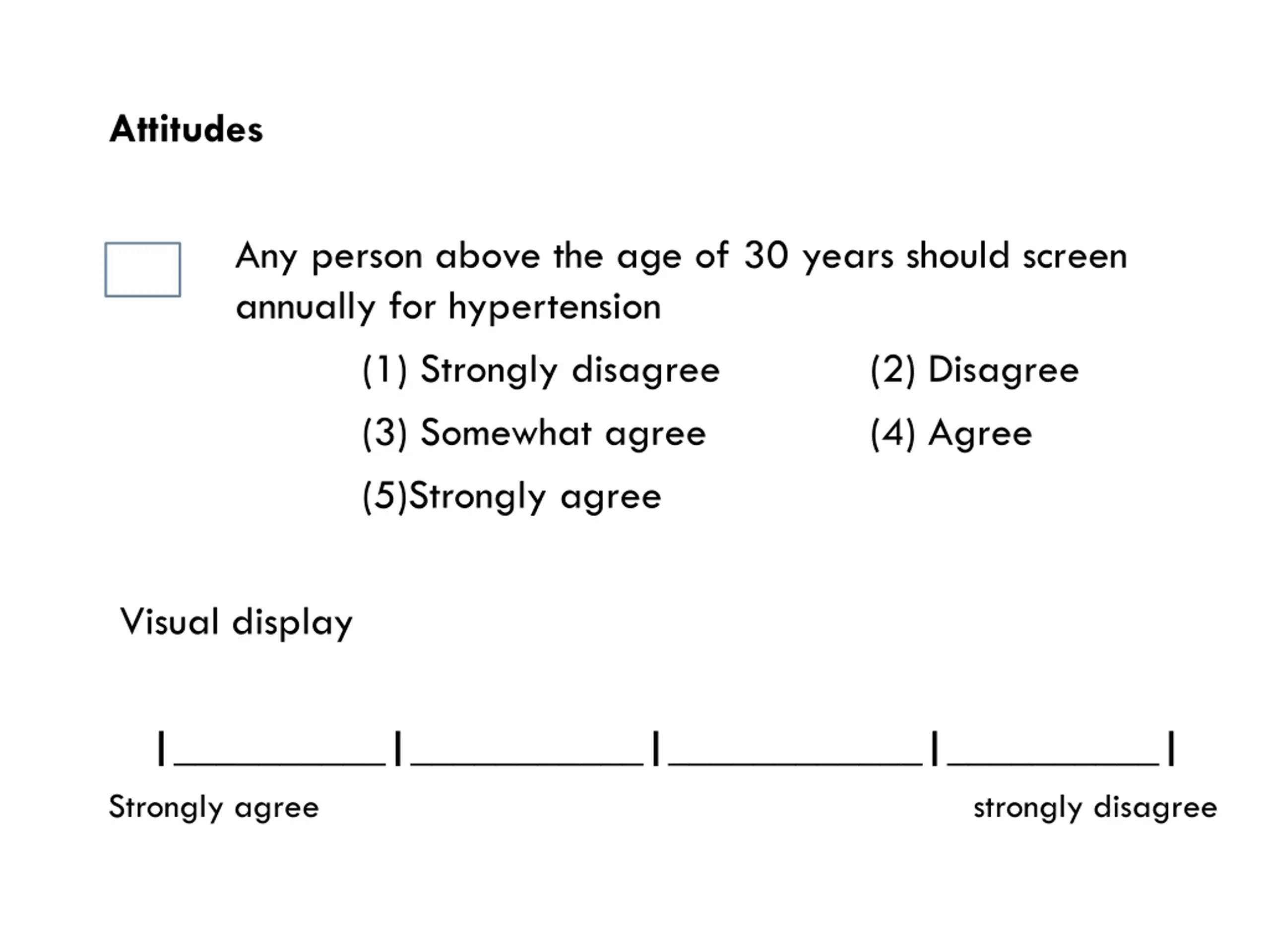 Attitudes Any person above the age of 30 years should screen annually for hypertension (1) Strongly disagree (3) Somewhat agree (5)Strongly agree (2) Disagree (4) Agree Visual display |__________|___________|____________|__________| Strongly agree strongly disagree