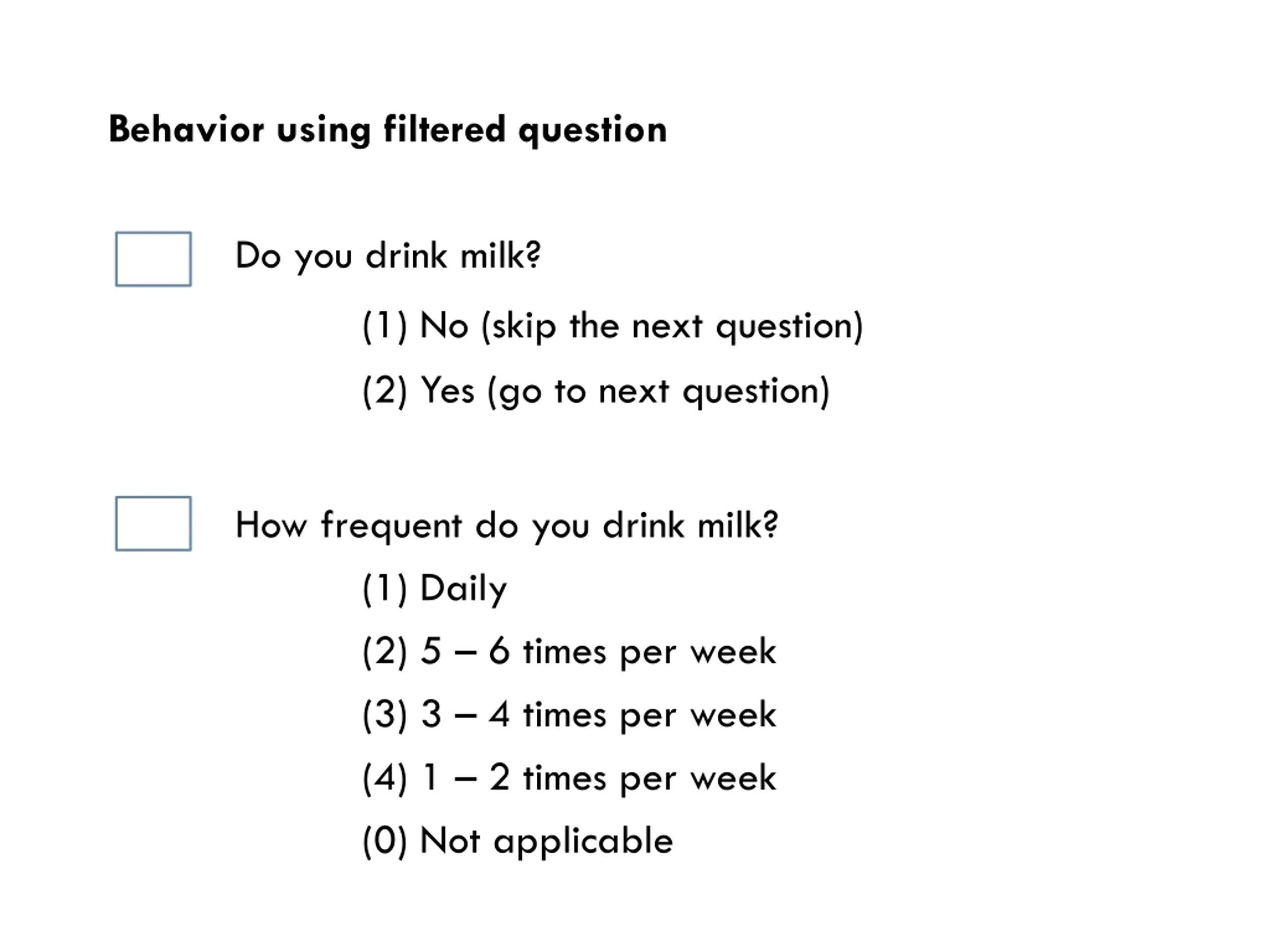 Behavior using filtered question Do you drink milk? (1) No (skip the next question) (2) Yes (go to next question) How frequent do you drink milk? (1) Daily (2) 5 6 times per week (3) 3 4 times per week (4) 1 2 times per week (0) Not applicable