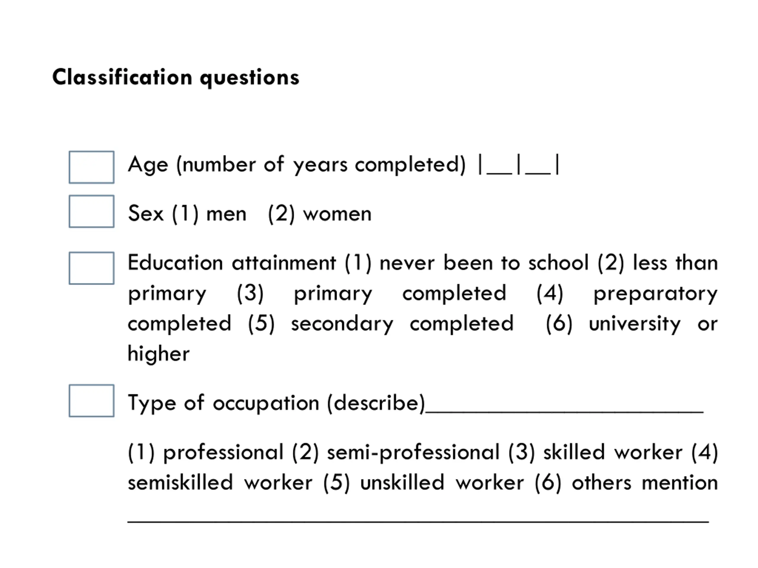 Classification questions Age (number of years completed) |__|__| Sex (1) men (2) women Education attainment (1) never been to school (2) less than primary (3) primary completed (4) preparatory completed (5) secondary completed (6) university or higher Type of occupation (describe)______________________ (1) professional (2) semi-professional (3) skilled worker (4) semiskilled worker (5) unskilled worker (6) others mention ______________________________________________