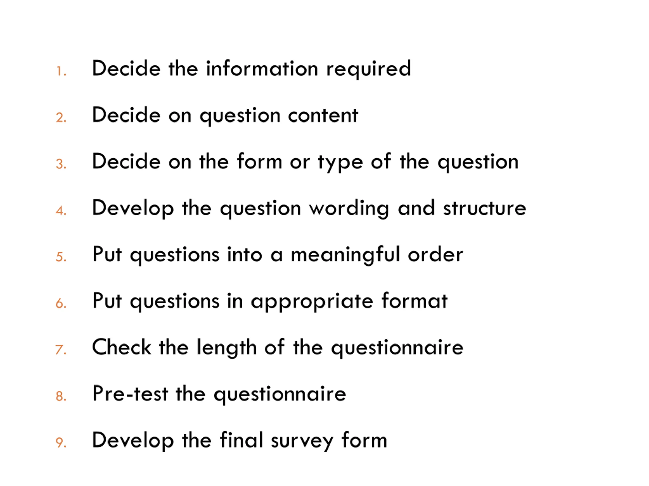 Decide the information required 1. Decide on question content 2. Decide on the form or type of the question 3. Develop the question wording and structure 4. Put questions into a meaningful order 5. Put questions in appropriate format 6. Check the length of the questionnaire 7. Pre-test the questionnaire 8. Develop the final survey form 9.