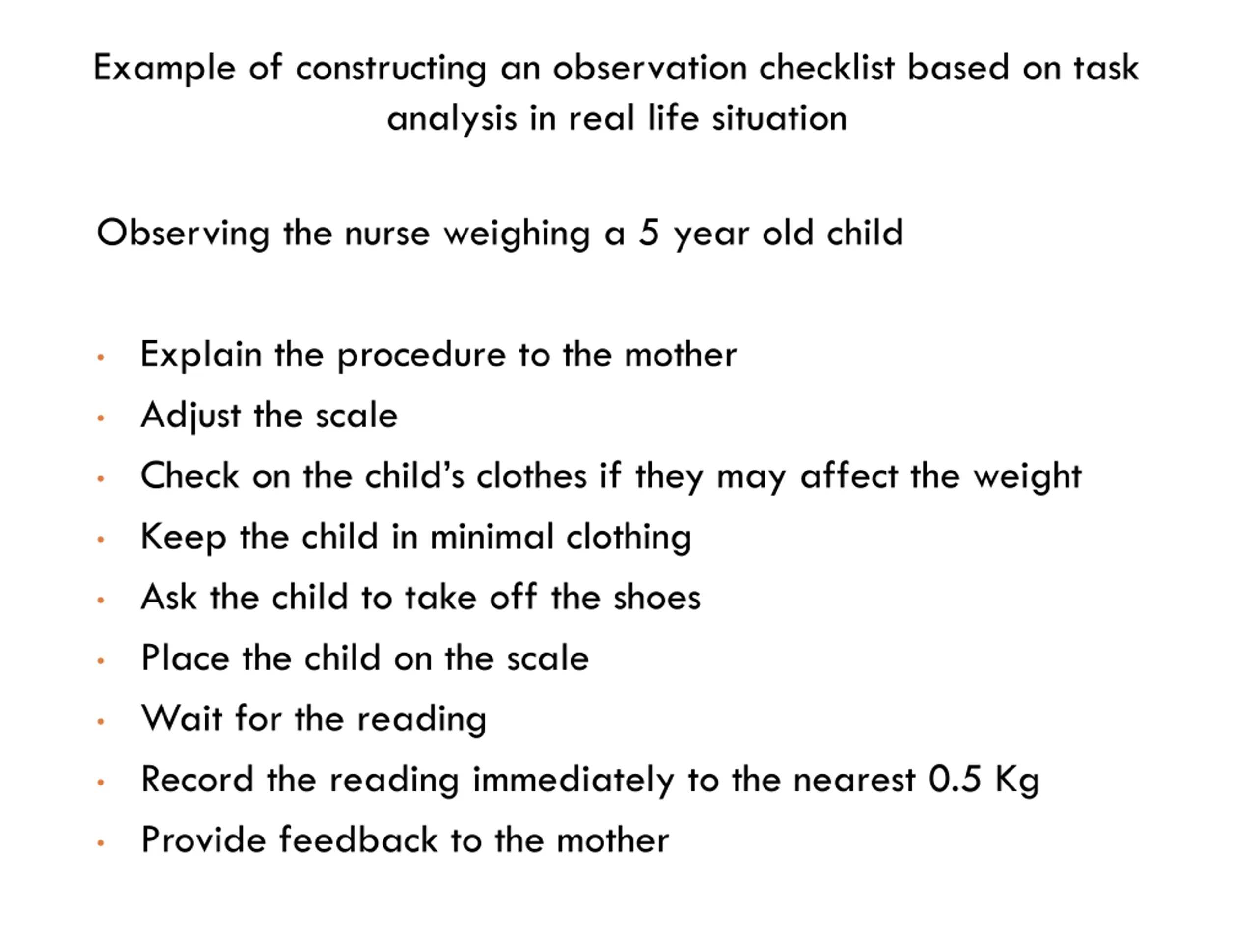 Example of constructing an observation checklist based on task analysis in real life situation Observing the nurse weighing a 5 year old child Explain the procedure to the mother Adjust the scale Check on the child s clothes if they may affect the weight Keep the child in minimal clothing Ask the child to take off the shoes Place the child on the scale Wait for the reading Record the reading immediately to the nearest 0.5 Kg Provide feedback to the mother