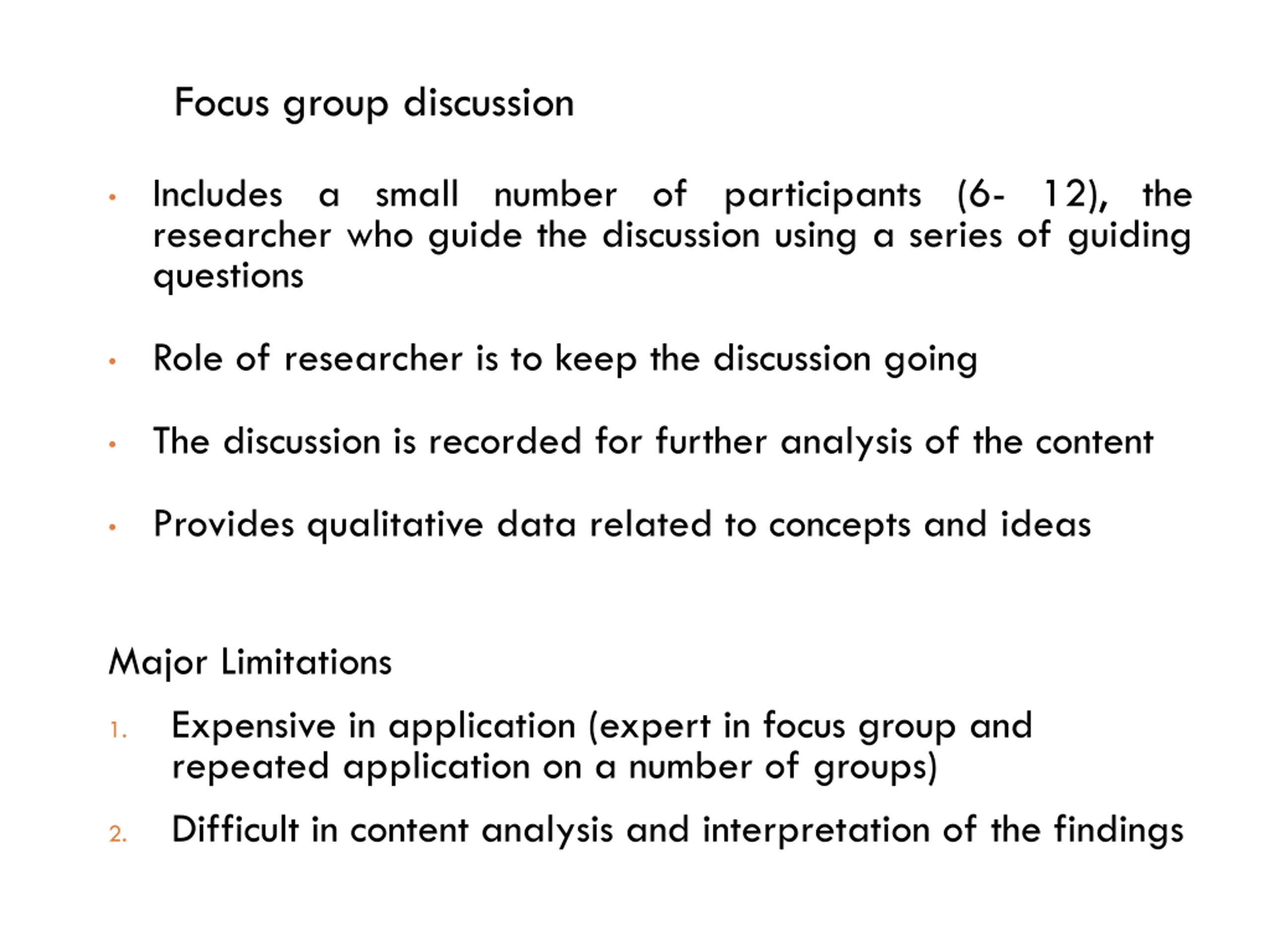 Focus group discussion Includes a small number of participants (6- 12), the researcher who guide the discussion using a series of guiding questions Role of researcher is to keep the discussion going The discussion is recorded for further analysis of the content Provides qualitative data related to concepts and ideas Major Limitations Expensive in application (expert in focus group and repeated application on a number of groups) Difficult in content analysis and interpretation of the findings 1. 2.