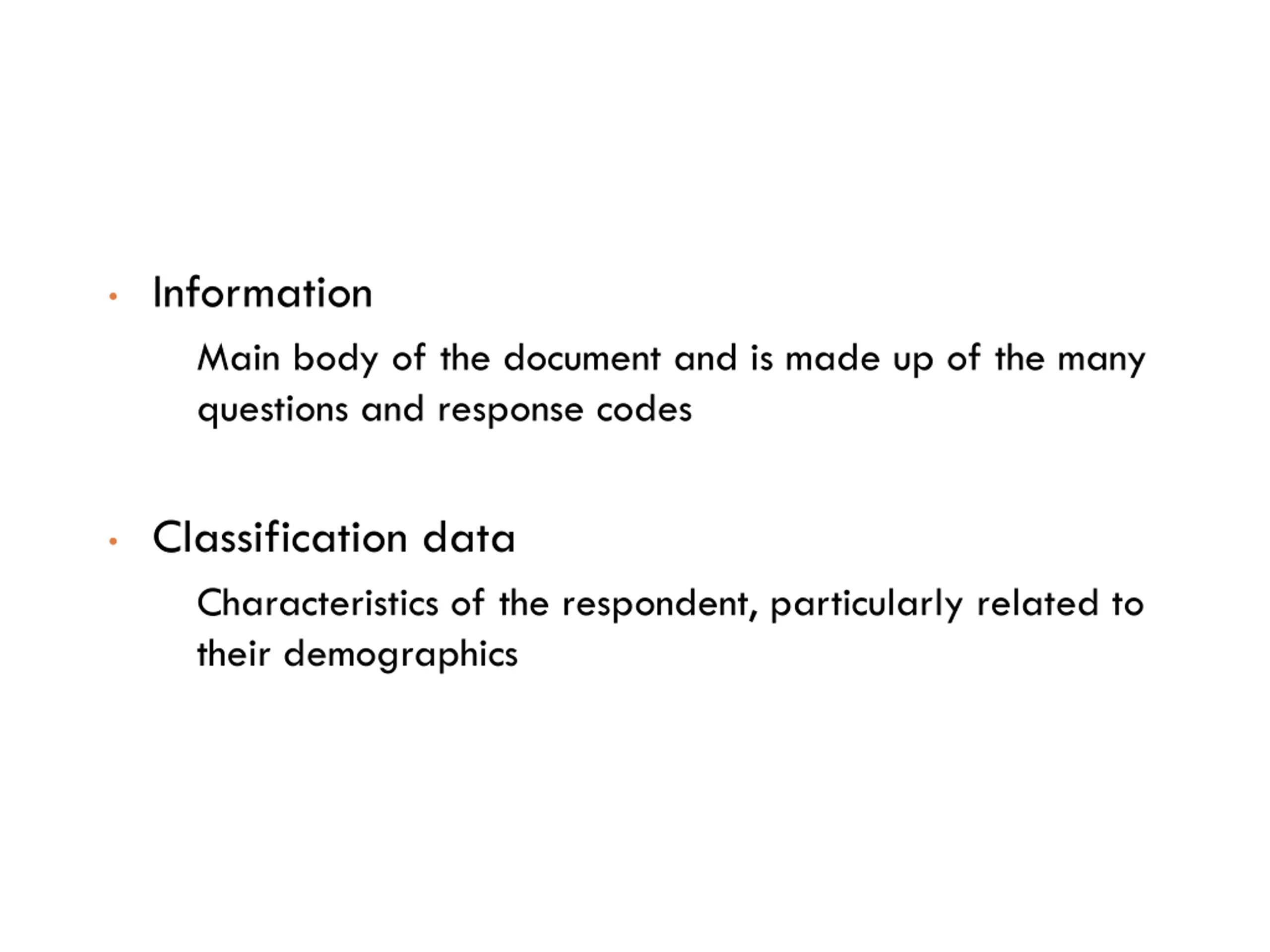 Information Main body of the document and is made up of the many questions and response codes Classification data Characteristics of the respondent, particularly related to their demographics