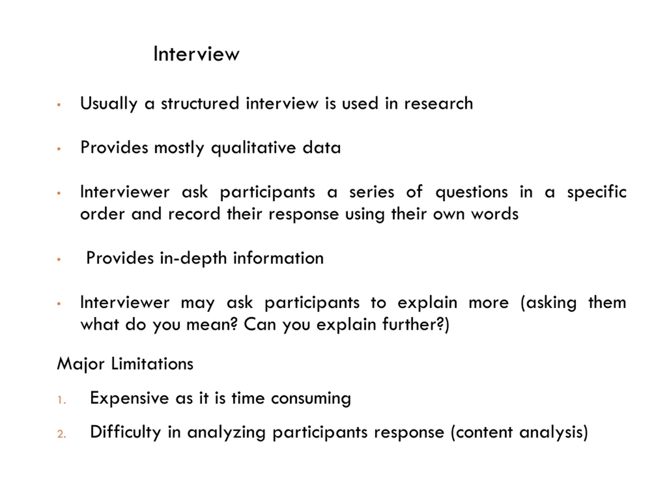 Interview Usually a structured interview is used in research Provides mostly qualitative data Interviewer ask participants a series of questions in a specific order and record their response using their own words Provides in-depth information Interviewer may ask participants to explain more (asking them what do you mean? Can you explain further?) Major Limitations Expensive as it is time consuming 1. Difficulty in analyzing participants response (content analysis) 2.