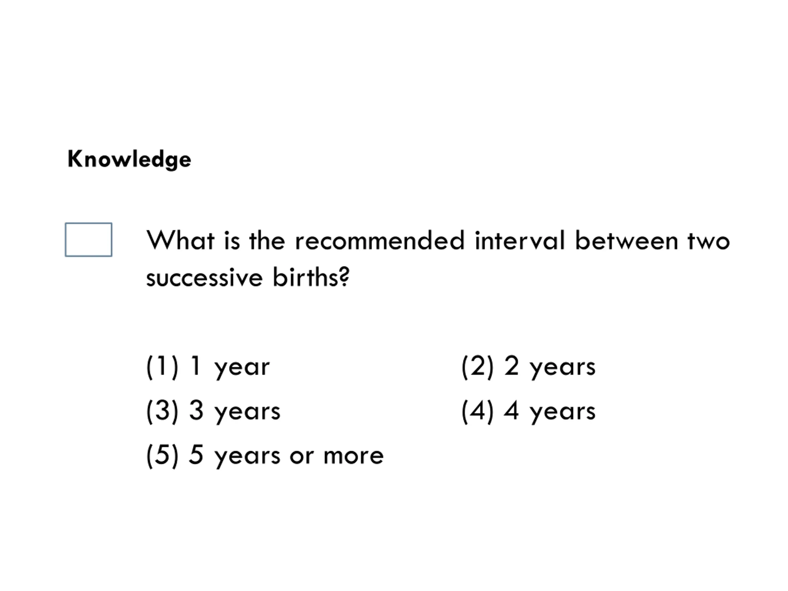 Knowledge What is the recommended interval between two successive births? (1) 1 year (2) 2 years (3) 3 years (5) 5 years or more (4) 4 years