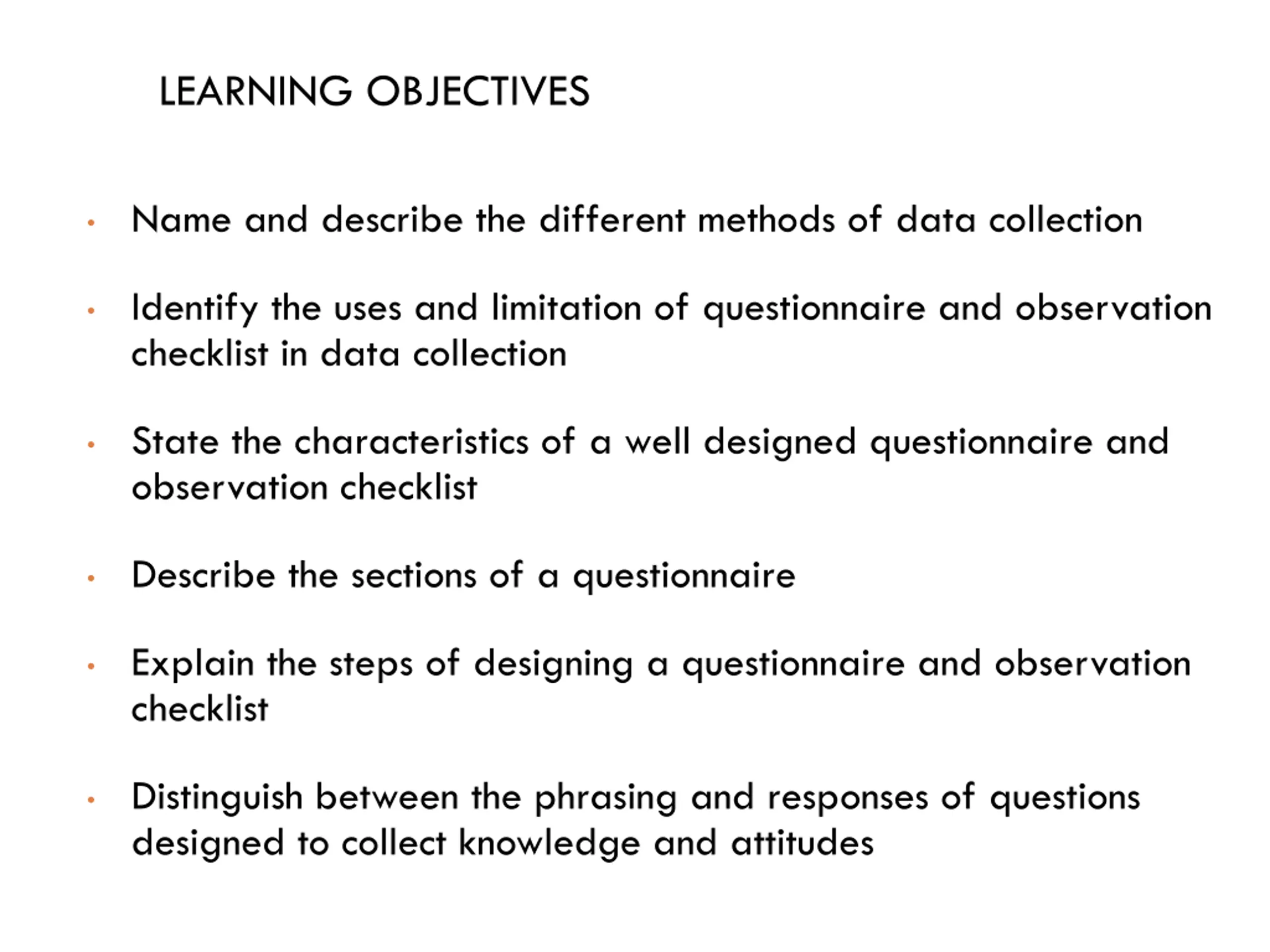 LEARNING OBJECTIVES Name and describe the different methods of data collection Identify the uses and limitation of questionnaire and observation checklist in data collection State the characteristics of a well designed questionnaire and observation checklist Describe the sections of a questionnaire Explain the steps of designing a questionnaire and observation checklist Distinguish between the phrasing and responses of questions designed to collect knowledge and attitudes