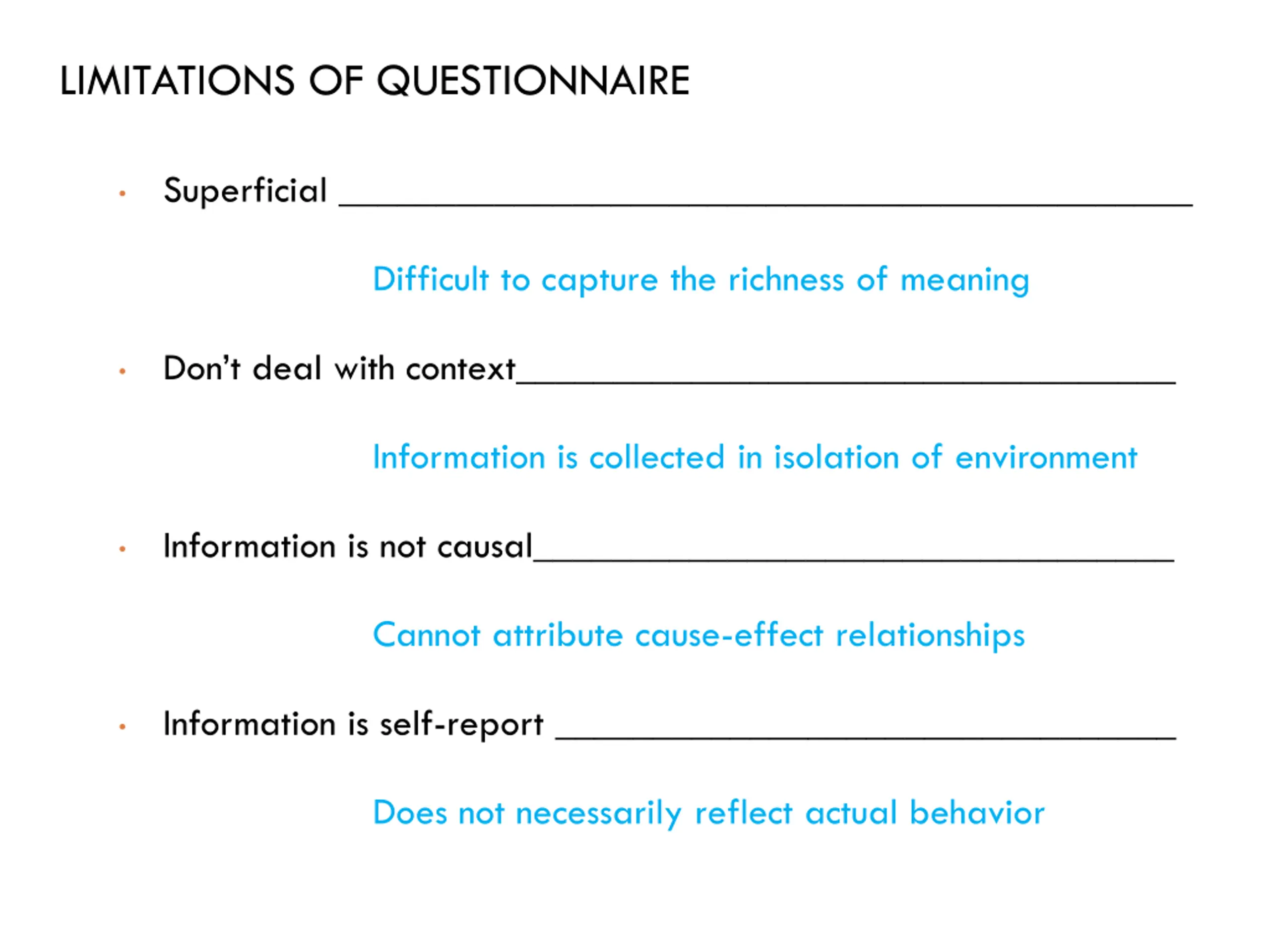 LIMITATIONS OF QUESTIONNAIRE Superficial ____________________________________________ Difficult to capture the richness of meaning Don t deal with context__________________________________ Information is collected in isolation of environment Information is not causal_________________________________ Cannot attribute cause-effect relationships Information is self-report ________________________________ Does not necessarily reflect actual behavior