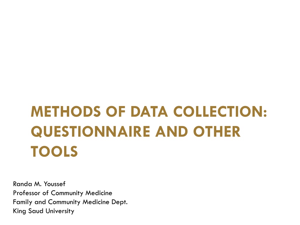 METHODS OF DATA COLLECTION: QUESTIONNAIRE AND OTHER TOOLS Randa M. Youssef Professor of Community Medicine Family and Community Medicine Dept. King Saud University RESEARCH PROJECT I