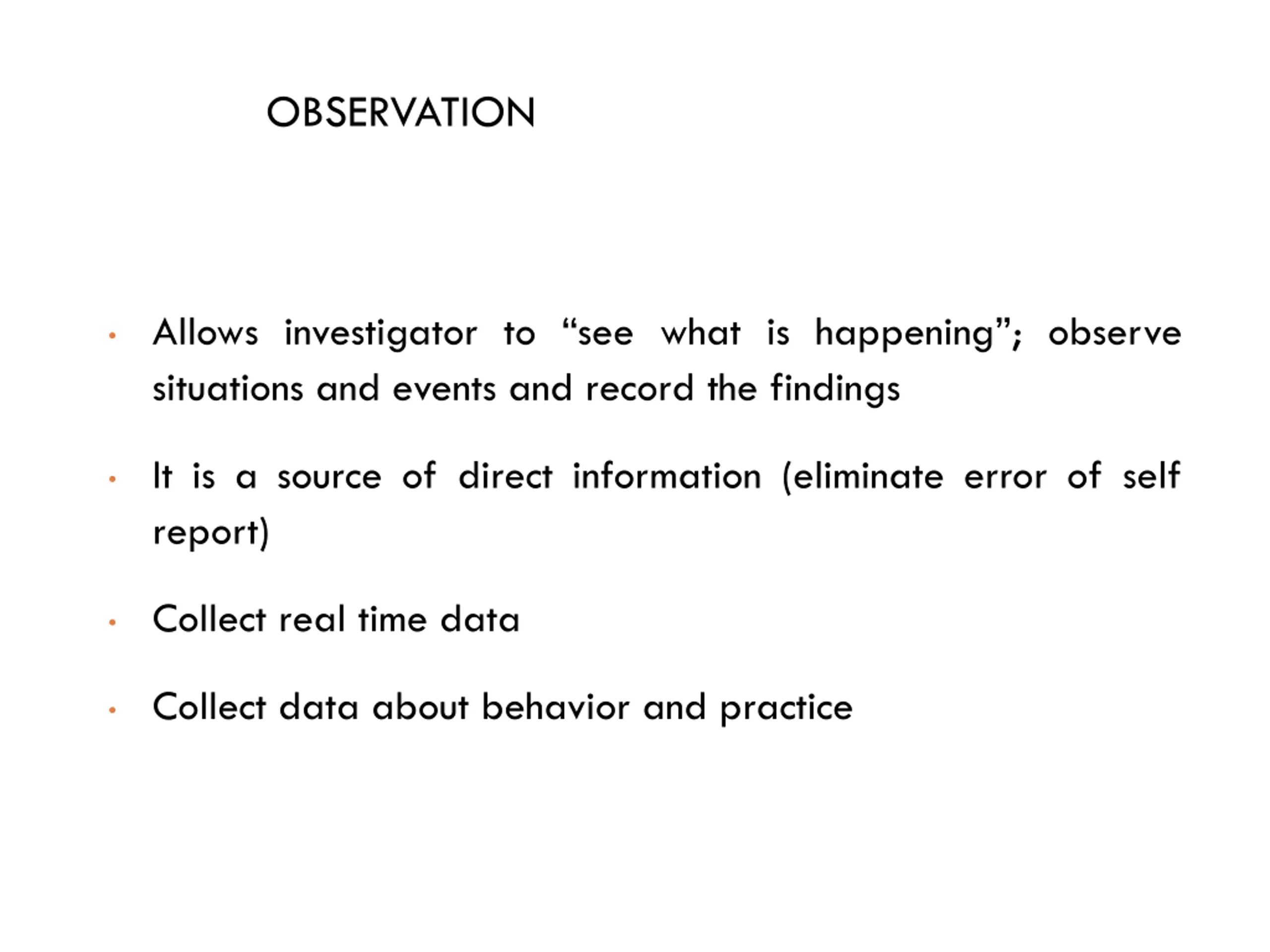 OBSERVATION Allows investigator to see what is happening ; observe situations and events and record the findings It is a source of direct information (eliminate error of self report) Collect real time data Collect data about behavior and practice