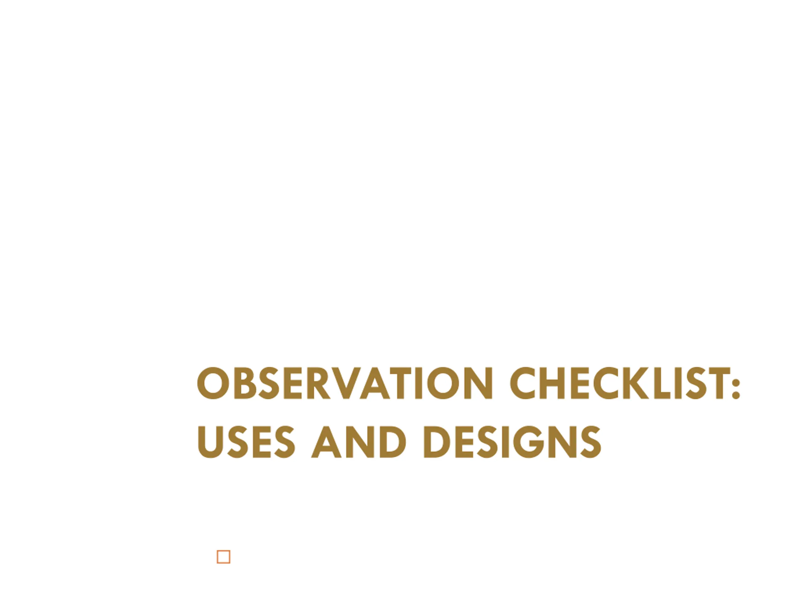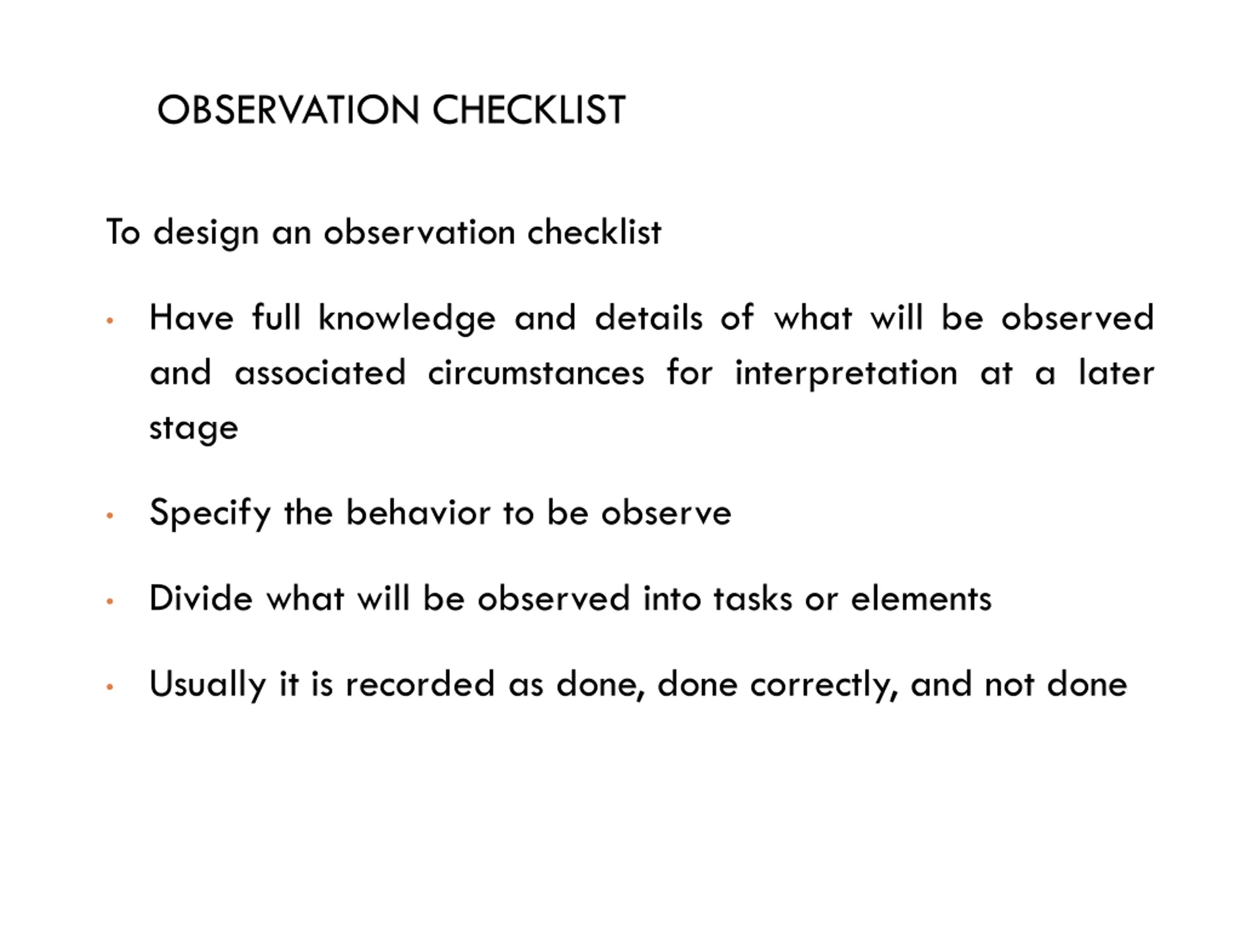 OBSERVATION CHECKLIST To design an observation checklist Have full knowledge and details of what will be observed and associated circumstances for interpretation at a later stage Specify the behavior to be observe Divide what will be observed into tasks or elements Usually it is recorded as done, done correctly, and not done