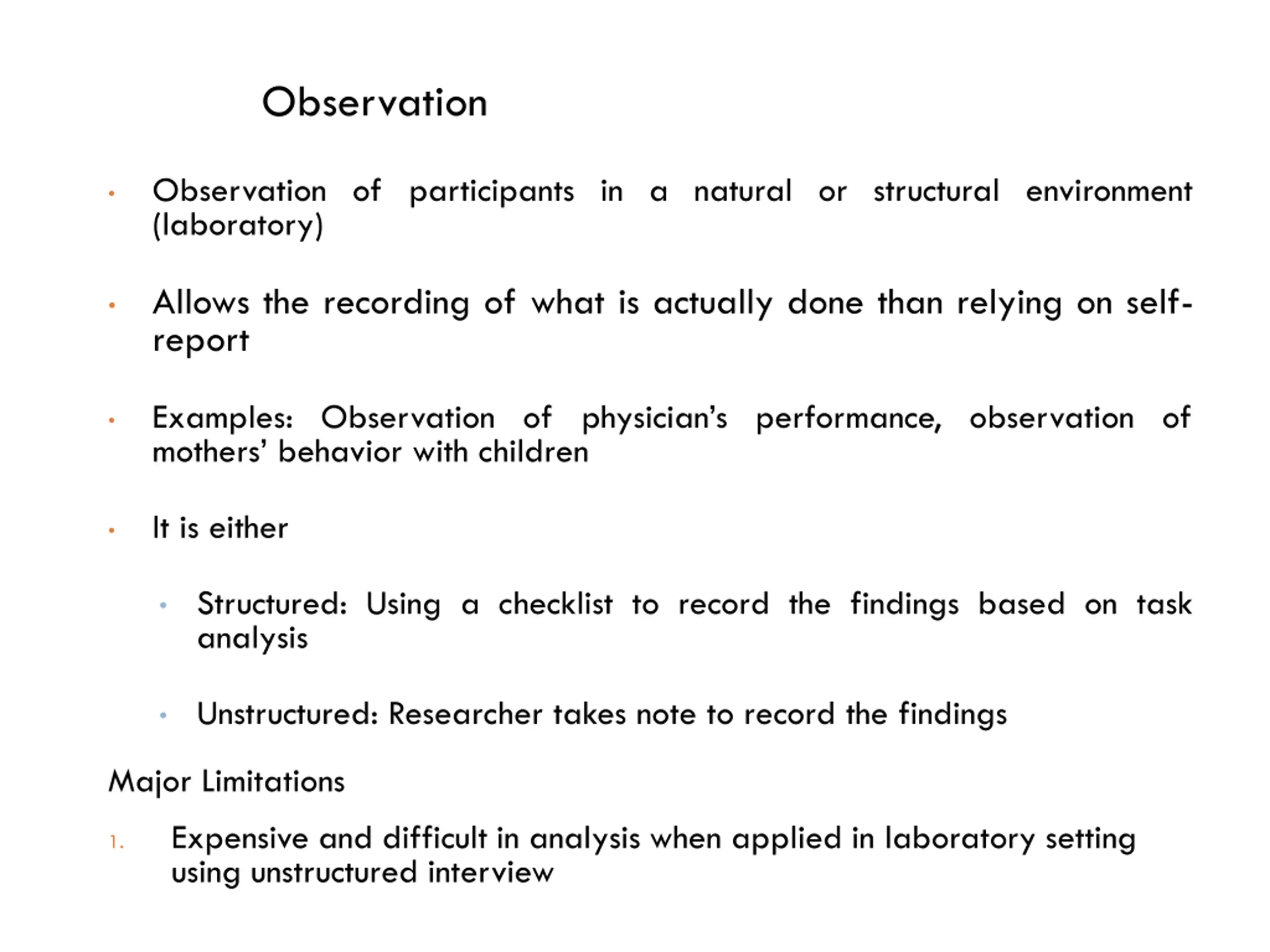 Observation Observation of participants in a natural or structural environment (laboratory) Allows the recording of what is actually done than relying on self- report Examples: Observation of physician s performance, observation of mothers behavior with children It is either Structured: Using a checklist to record the findings based on task analysis Unstructured: Researcher takes note to record the findings Major Limitations Expensive and difficult in analysis when applied in laboratory setting using unstructured interview 1.