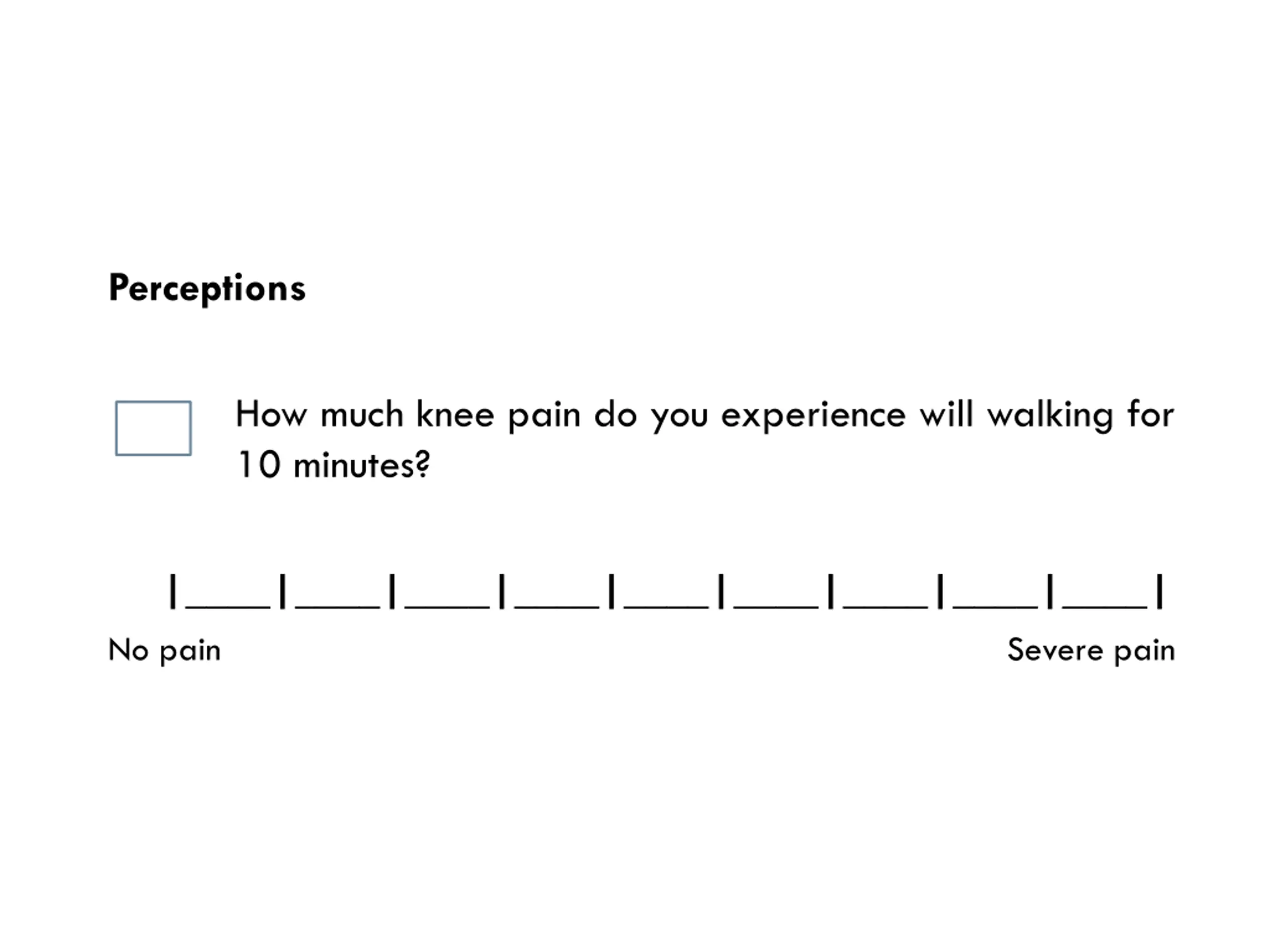 Perceptions How much knee pain do you experience will walking for 10 minutes? |____|____|____|____|____|____|____|____|____| No pain Severe pain