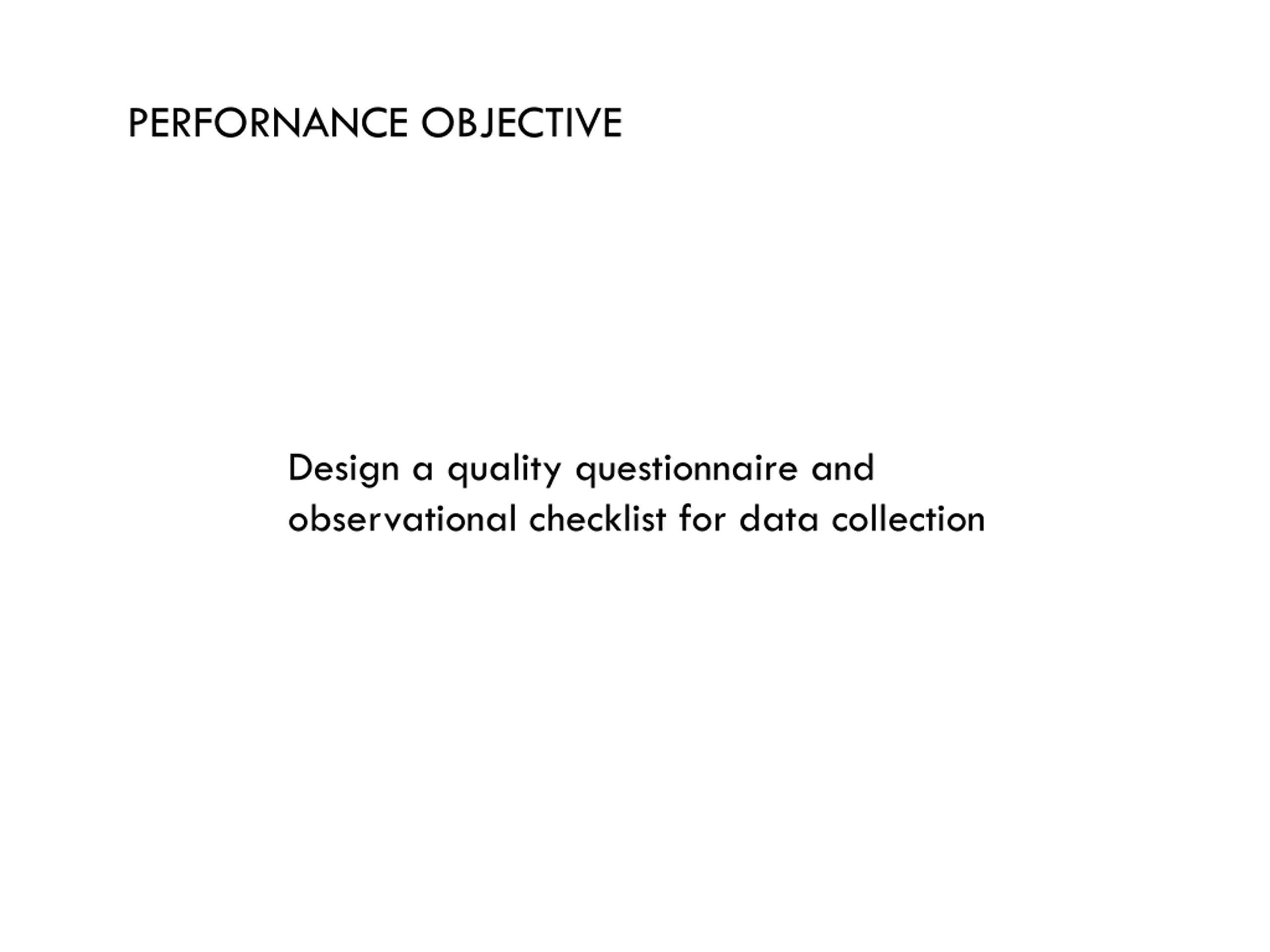 PERFORNANCE OBJECTIVE Design a quality questionnaire and observational checklist for data collection