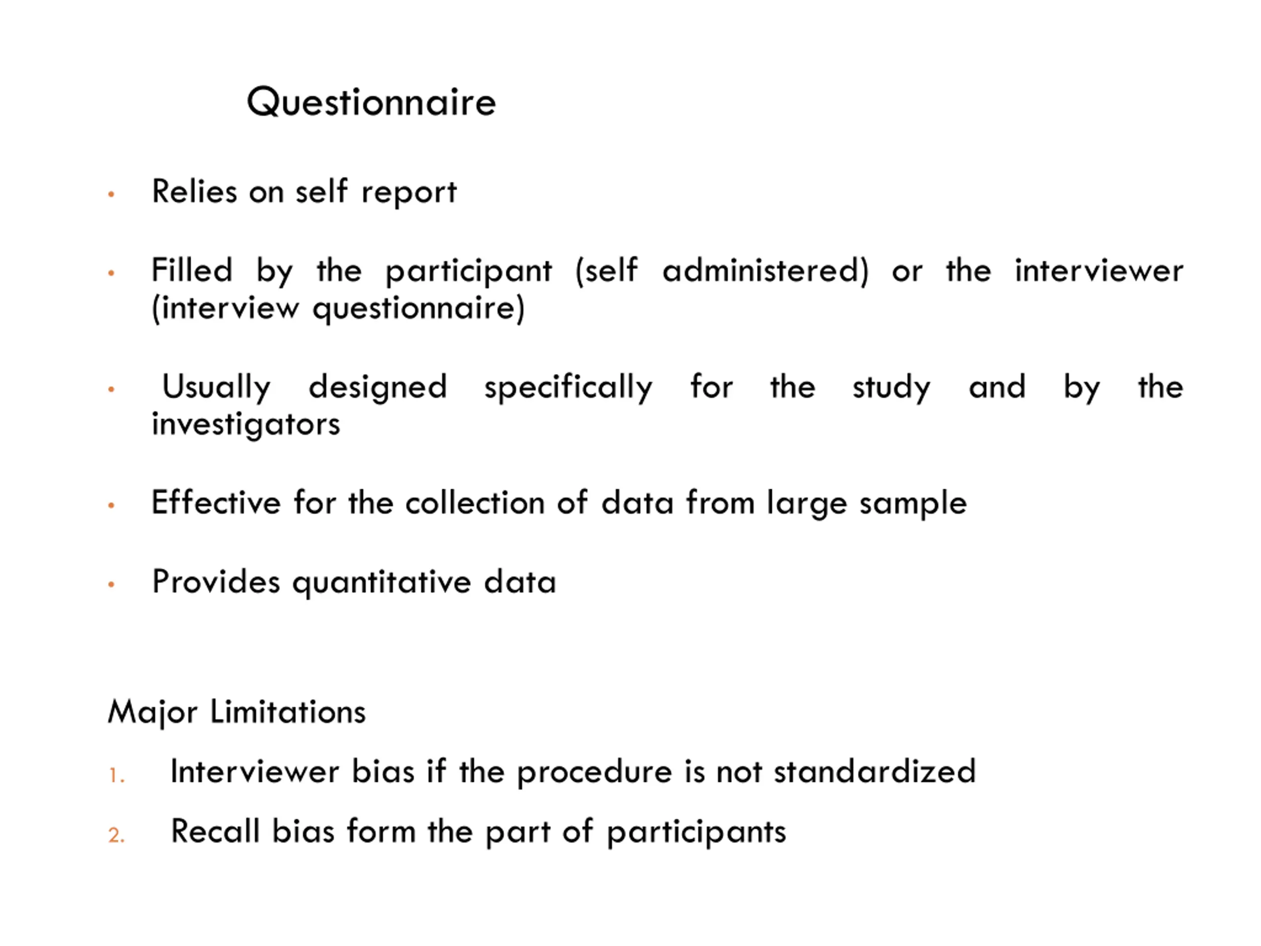 Questionnaire Relies on self report Filled by the participant (self administered) or the interviewer (interview questionnaire) Usually designed specifically for the study and by the investigators Effective for the collection of data from large sample Provides quantitative data Major Limitations Interviewer bias if the procedure is not standardized Recall bias form the part of participants 1. 2.