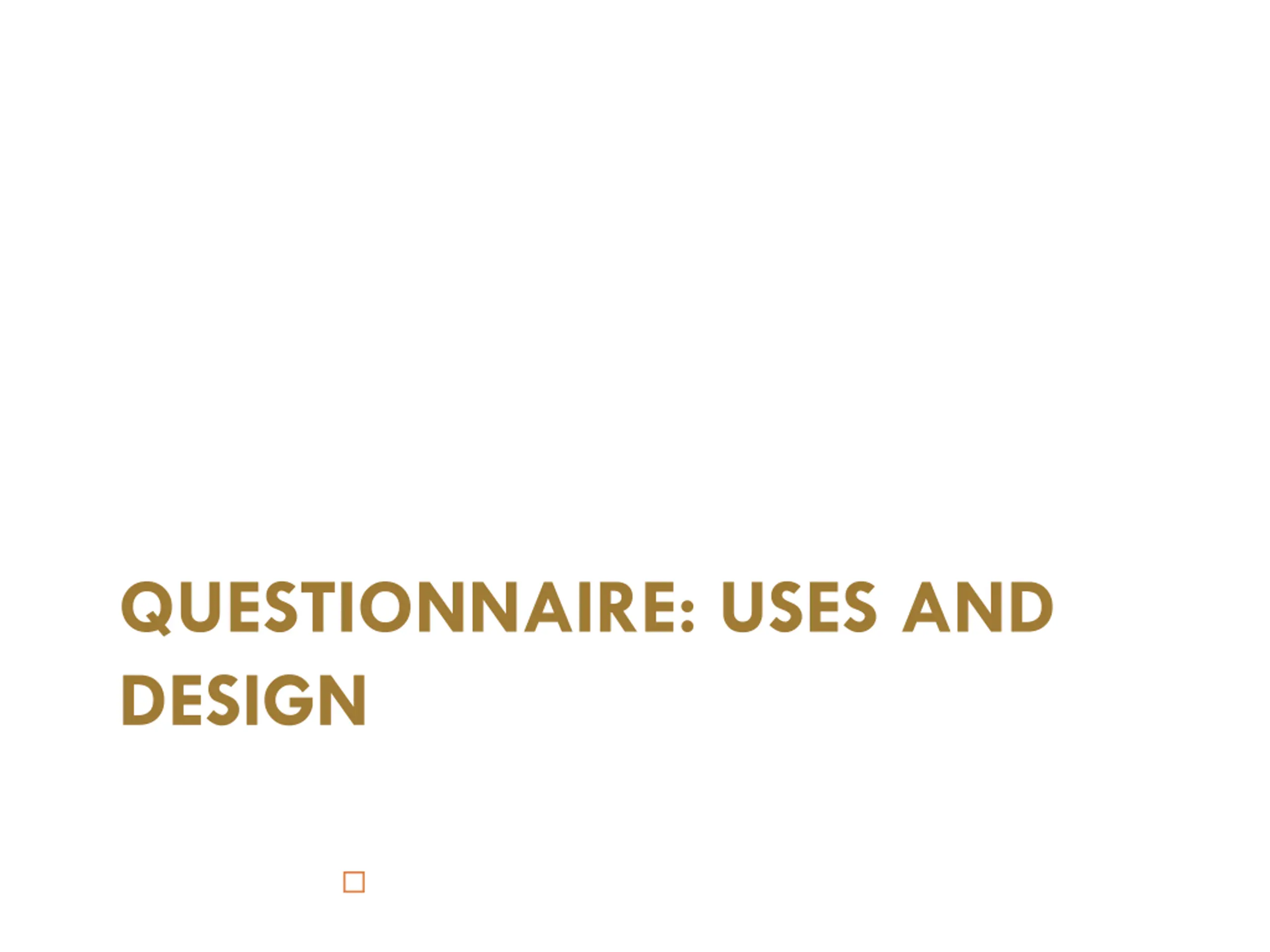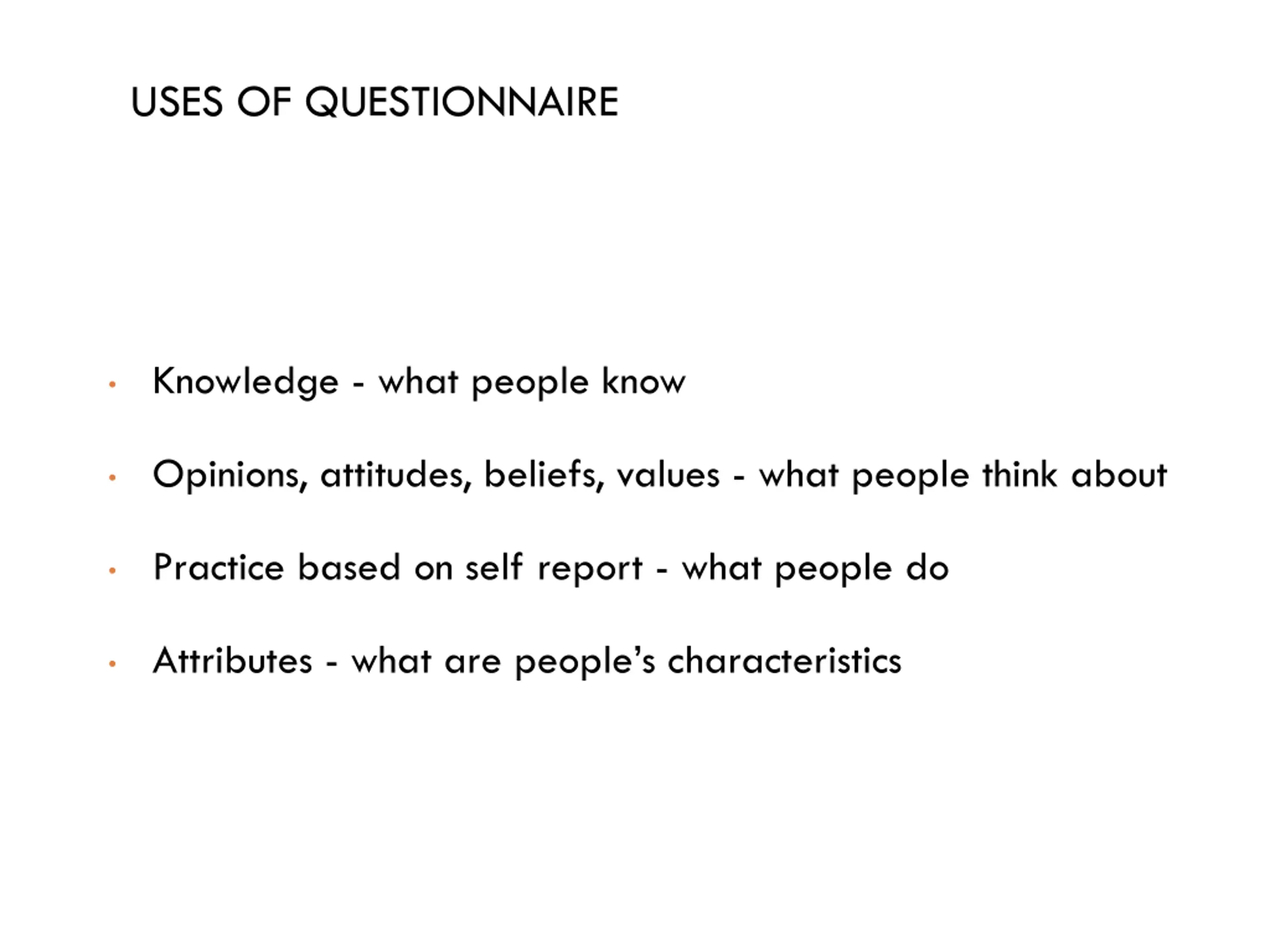 USES OF QUESTIONNAIRE Knowledge - what people know Opinions, attitudes, beliefs, values - what people think about Practice based on self report - what people do Attributes - what are people s characteristics