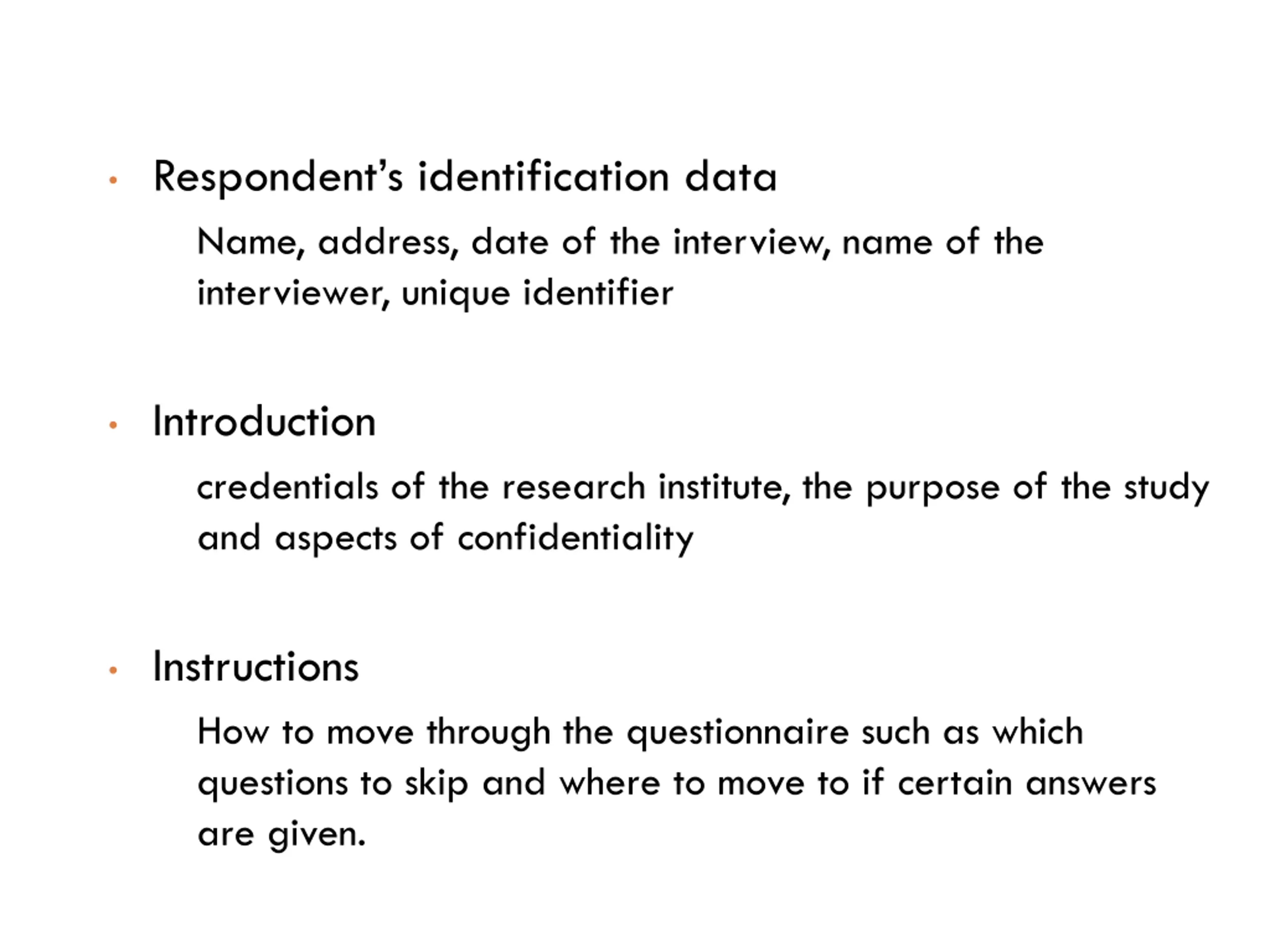 Respondents identification data Name, address, date of the interview, name of the interviewer, unique identifier Introduction credentials of the research institute, the purpose of the study and aspects of confidentiality Instructions How to move through the questionnaire such as which questions to skip and where to move to if certain answers are given.