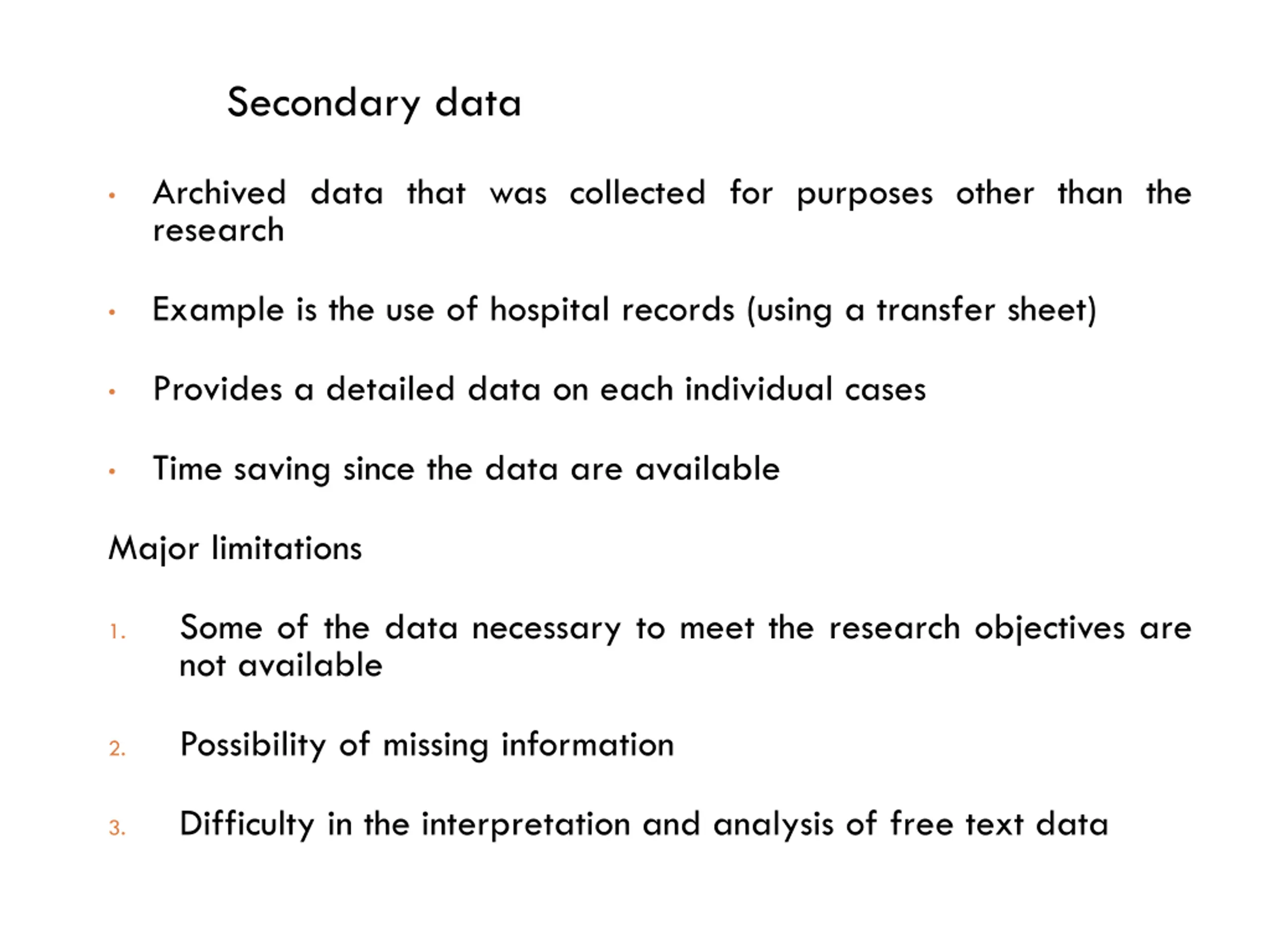 Secondary data Archived data that was collected for purposes other than the research Example is the use of hospital records (using a transfer sheet) Provides a detailed data on each individual cases Time saving since the data are available Major limitations Some of the data necessary to meet the research objectives are not available 1. Possibility of missing information 2. Difficulty in the interpretation and analysis of free text data 3.