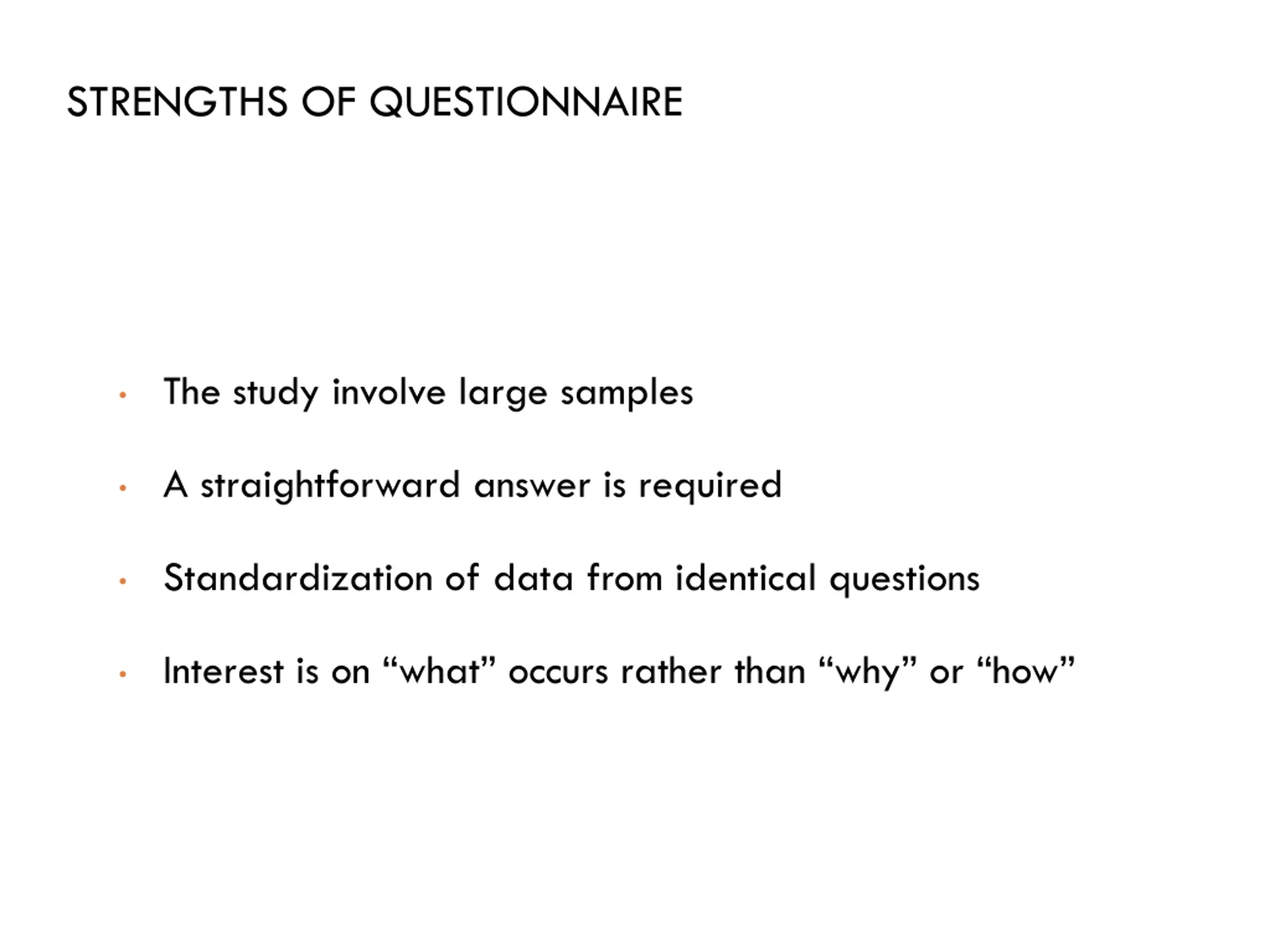 STRENGTHS OF QUESTIONNAIRE The study involve large samples A straightforward answer is required Standardization of data from identical questions Interest is on what occurs rather than why or how