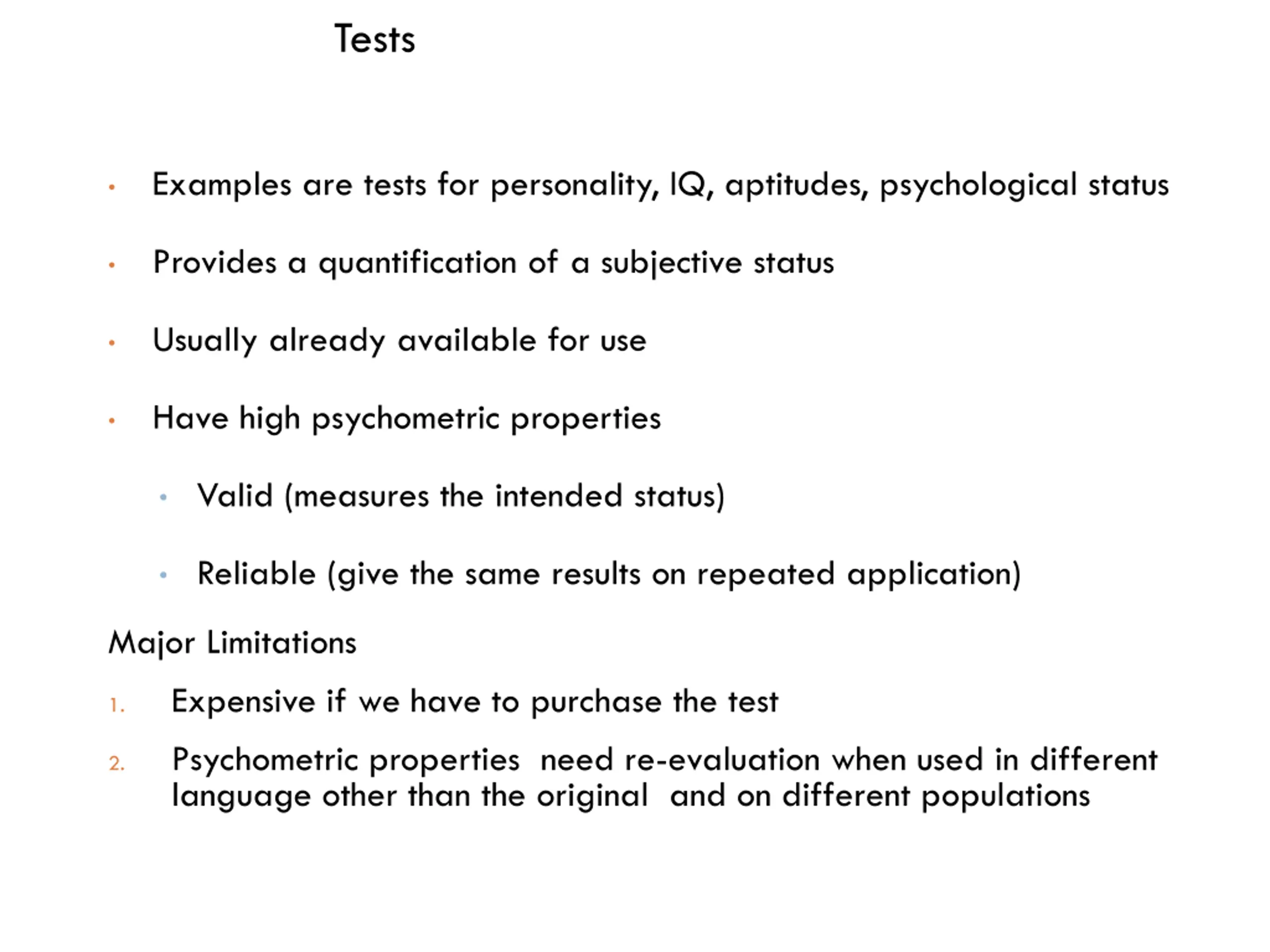 Tests Examples are tests for personality, IQ, aptitudes, psychological status Provides a quantification of a subjective status Usually already available for use Have high psychometric properties Valid (measures the intended status) Reliable (give the same results on repeated application) Major Limitations Expensive if we have to purchase the test Psychometric properties need re-evaluation when used in different language other than the original and on different populations 1. 2.