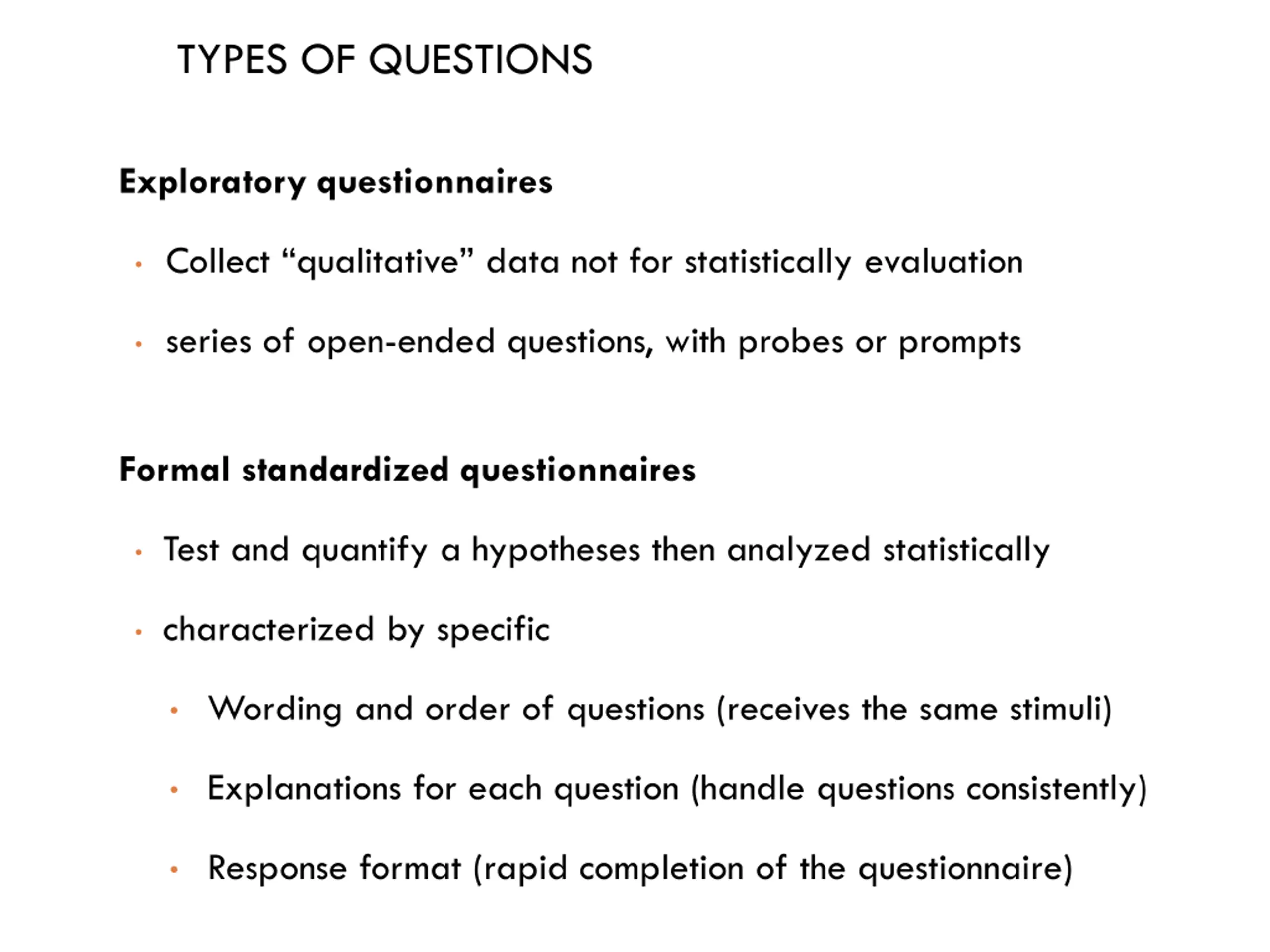 TYPES OF QUESTIONS Exploratory questionnaires Collect qualitative data not for statistically evaluation series of open-ended questions, with probes or prompts Formal standardized questionnaires Test and quantify a hypotheses then analyzed statistically characterized by specific Wording and order of questions (receives the same stimuli) Explanations for each question (handle questions consistently) Response format (rapid completion of the questionnaire)