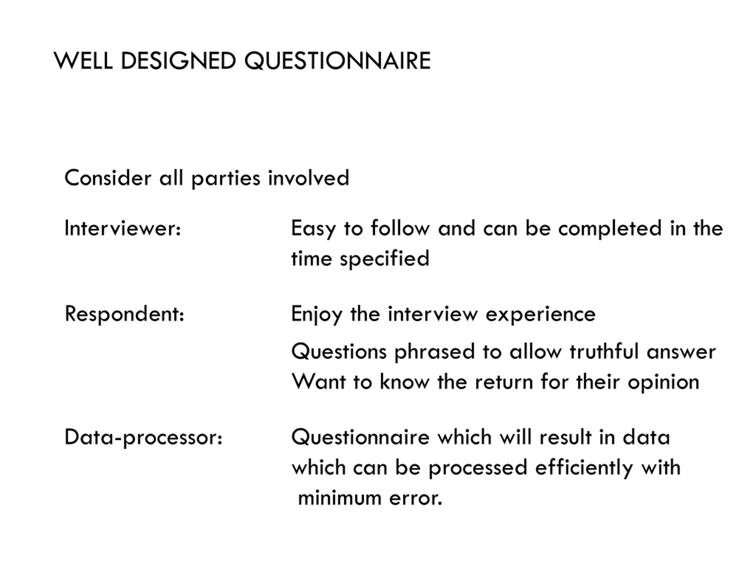 WELL DESIGNED QUESTIONNAIRE Consider all parties involved Interviewer: Easy to follow and can be completed in the time specified Respondent: Enjoy the interview experience Questions phrased to allow truthful answer Want to know the return for their opinion Data-processor: Questionnaire which will result in data which can be processed efficiently with minimum error.