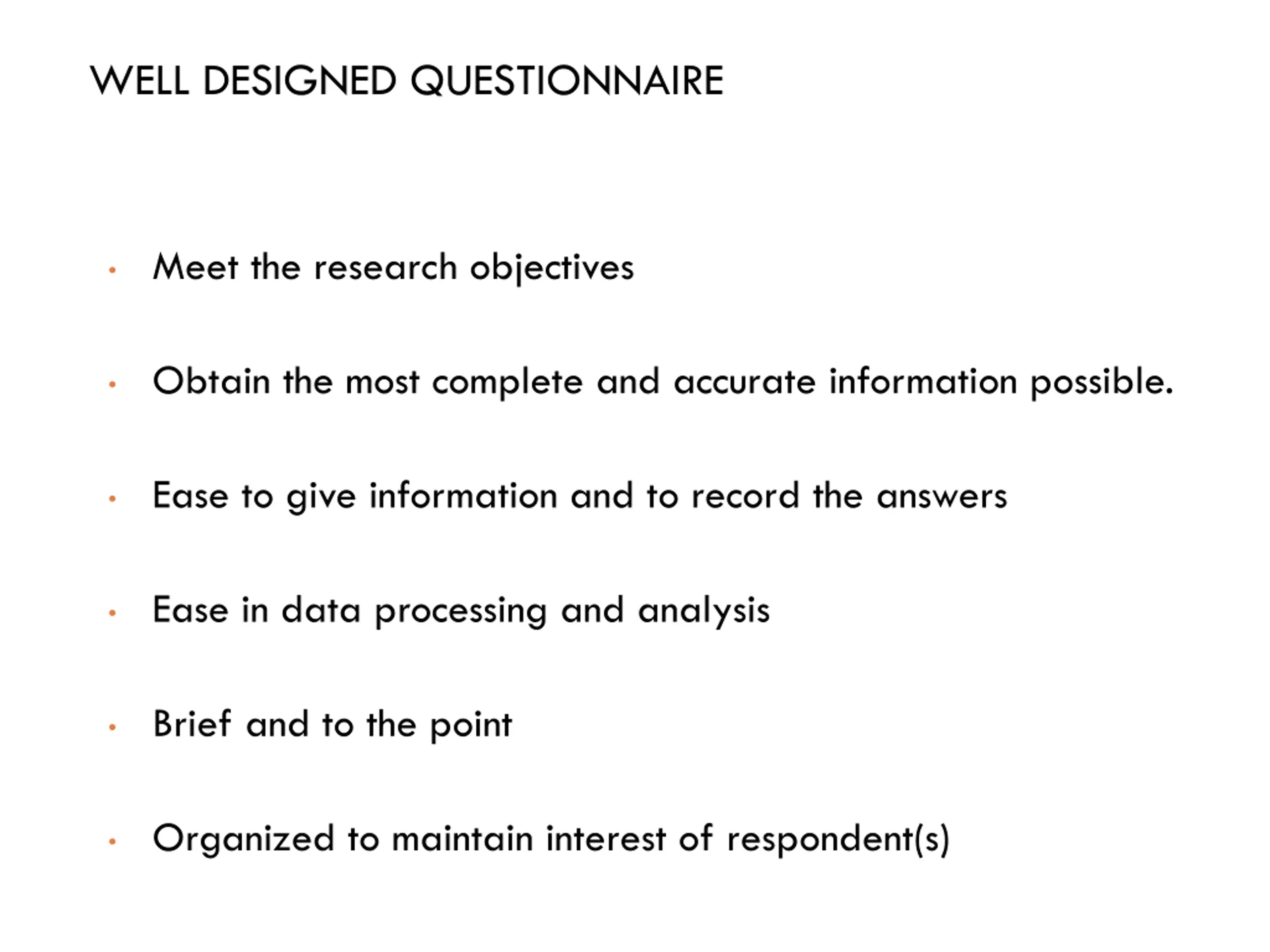 WELL DESIGNED QUESTIONNAIRE Meet the research objectives Obtain the most complete and accurate information possible. Ease to give information and to record the answers Ease in data processing and analysis Brief and to the point Organized to maintain interest of respondent(s)