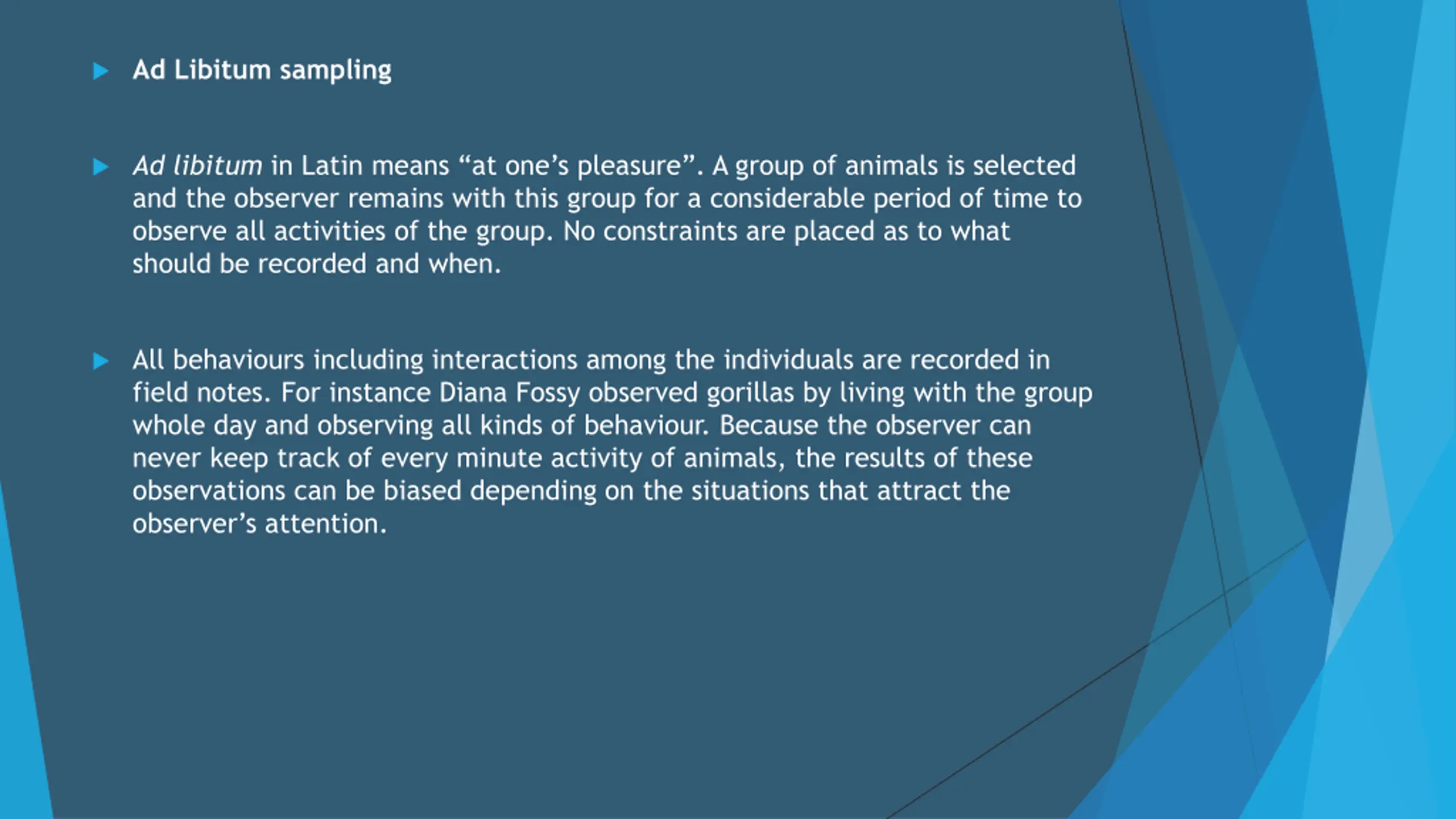 Ad Libitum sampling Ad libitum in Latin means at one s pleasure . A group of animals is selected and the observer remains with this group for a considerable period of time to observe all activities of the group. No constraints are placed as to what should be recorded and when. All behaviours including interactions among the individuals are recorded in field notes. For instance Diana Fossy observed gorillas by living with the group whole day and observing all kinds of behaviour. Because the observer can never keep track of every minute activity of animals, the results of these observations can be biased depending on the situations that attract the observer s attention.