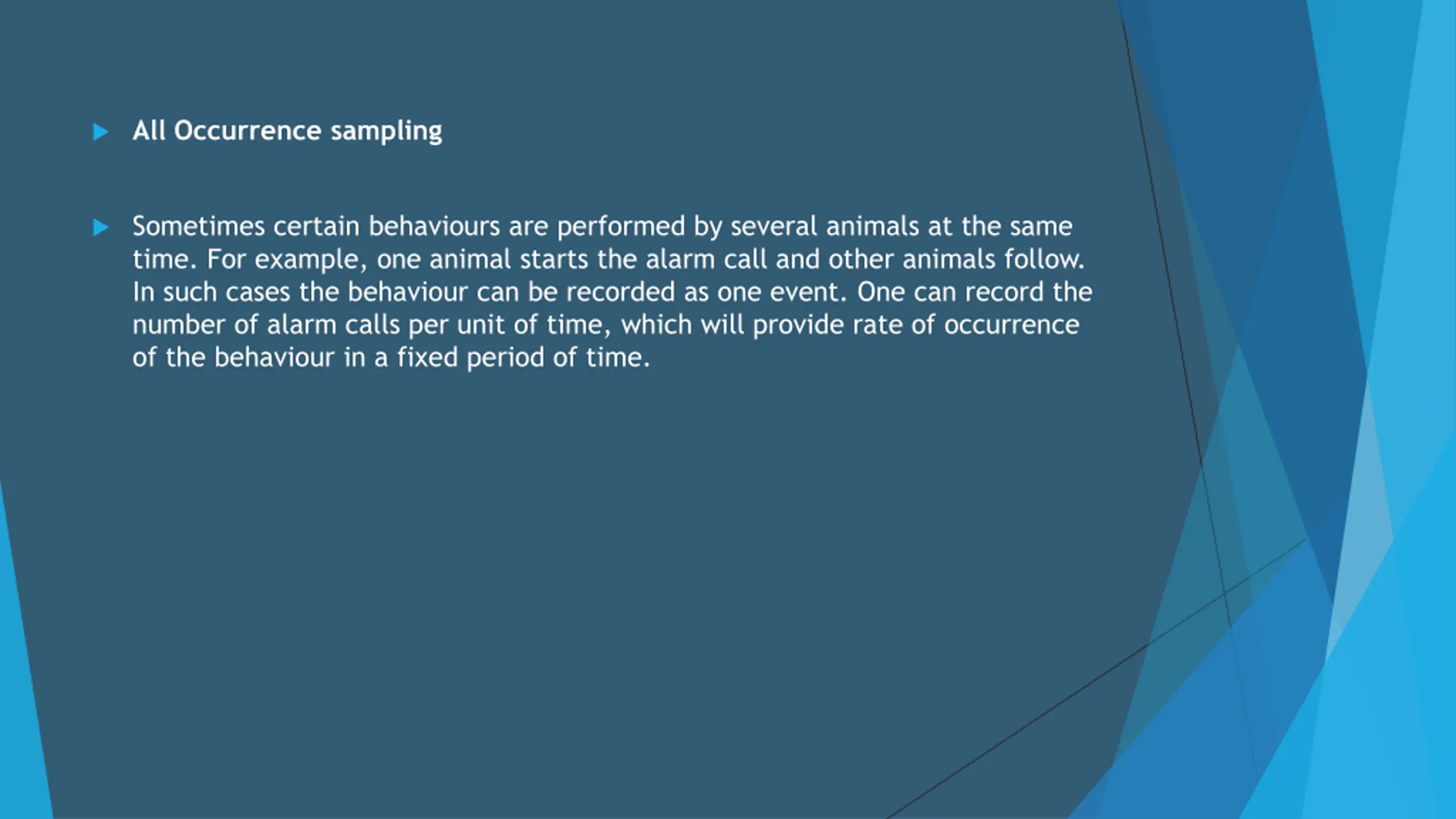 All Occurrence sampling Sometimes certain behaviours are performed by several animals at the same time. For example, one animal starts the alarm call and other animals follow. In such cases the behaviour can be recorded as one event. One can record the number of alarm calls per unit of time, which will provide rate of occurrence of the behaviour in a fixed period of time.
