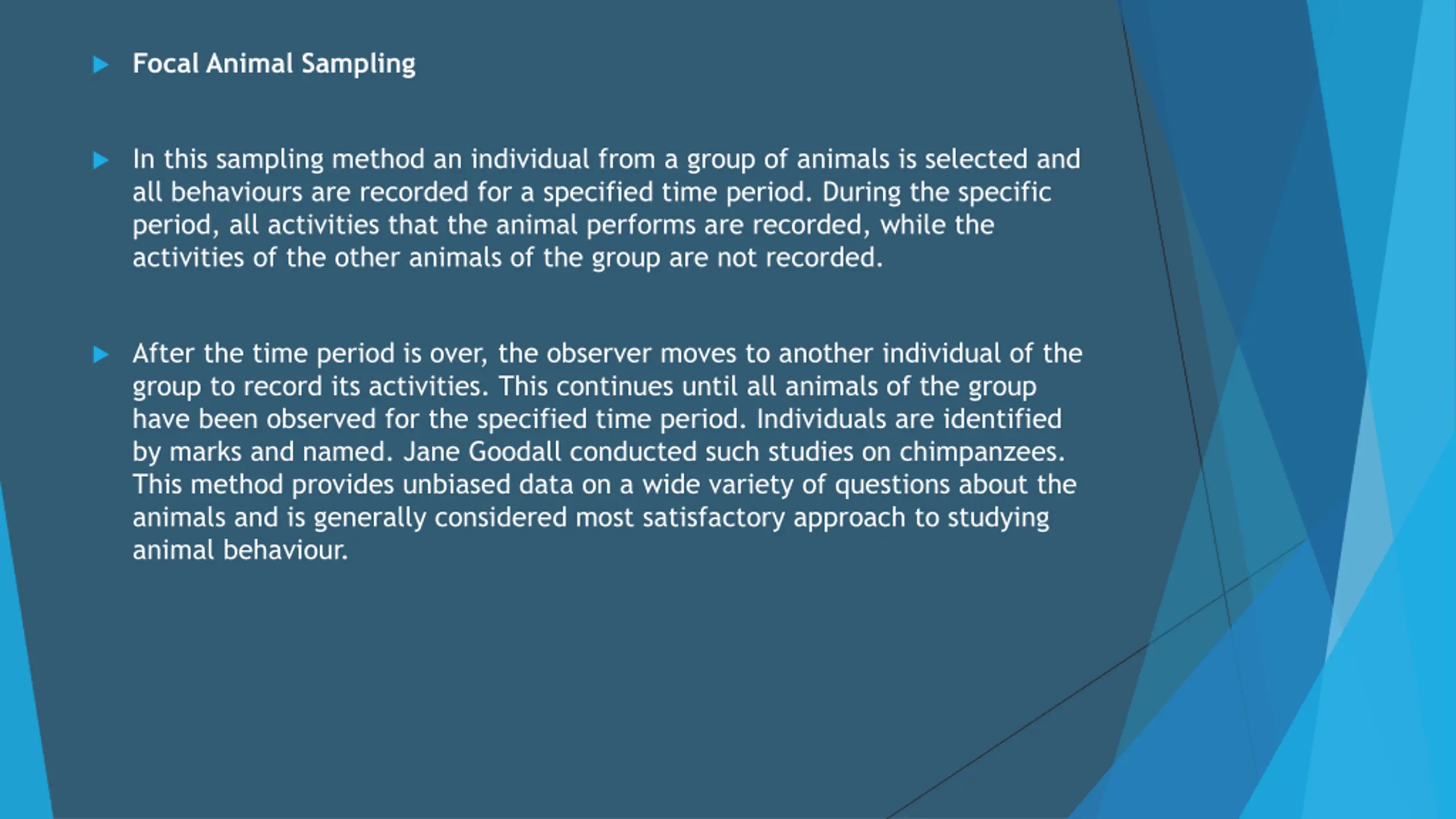 Focal Animal Sampling In this sampling method an individual from a group of animals is selected and all behaviours are recorded for a specified time period. During the specific period, all activities that the animal performs are recorded, while the activities of the other animals of the group are not recorded. After the time period is over, the observer moves to another individual of the group to record its activities. This continues until all animals of the group have been observed for the specified time period. Individuals are identified by marks and named. Jane Goodall conducted such studies on chimpanzees. This method provides unbiased data on a wide variety of questions about the animals and is generally considered most satisfactory approach to studying animal behaviour.