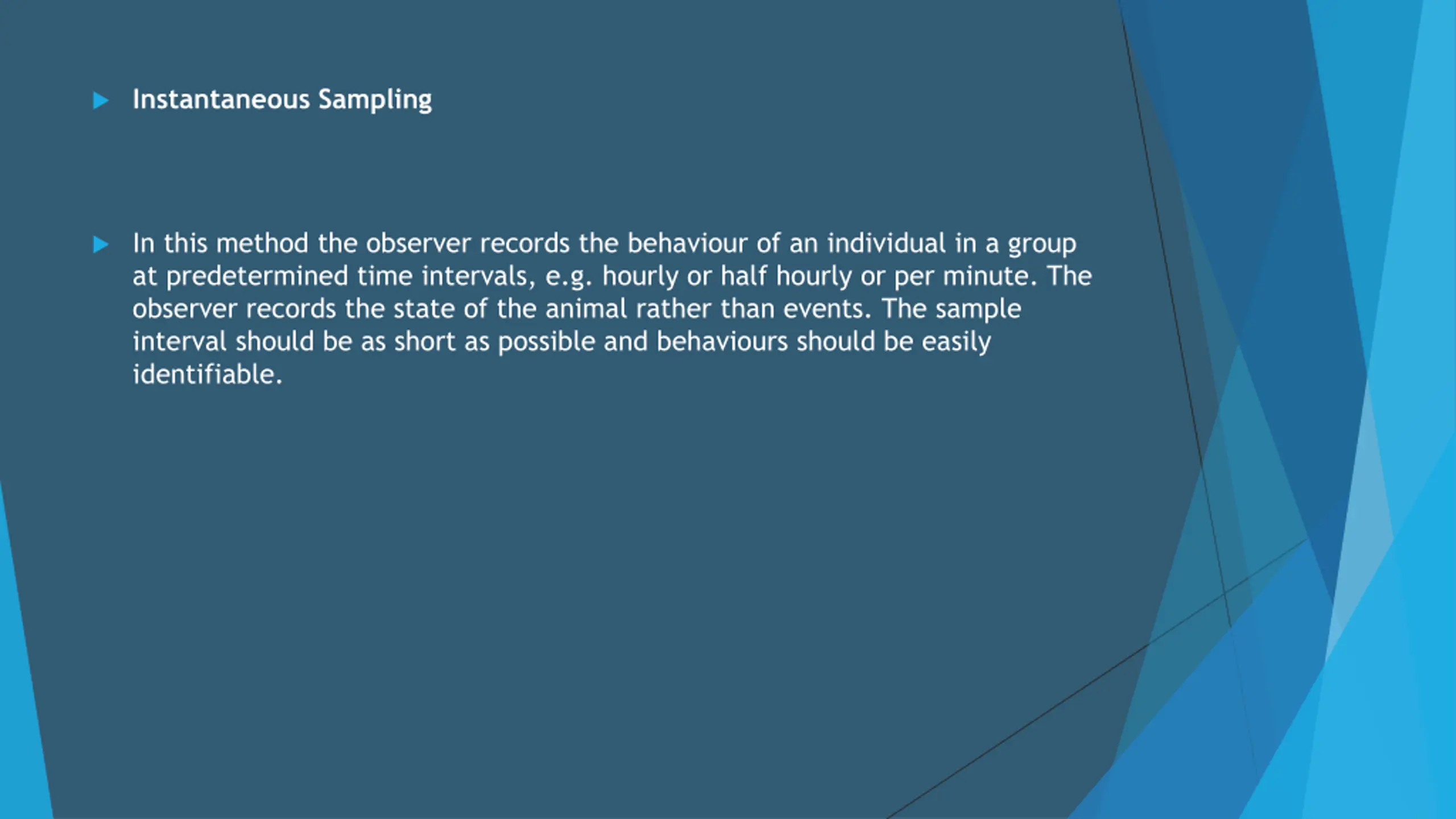 Instantaneous Sampling In this method the observer records the behaviour of an individual in a group at predetermined time intervals, e.g. hourly or half hourly or per minute. The observer records the state of the animal rather than events. The sample interval should be as short as possible and behaviours should be easily identifiable.