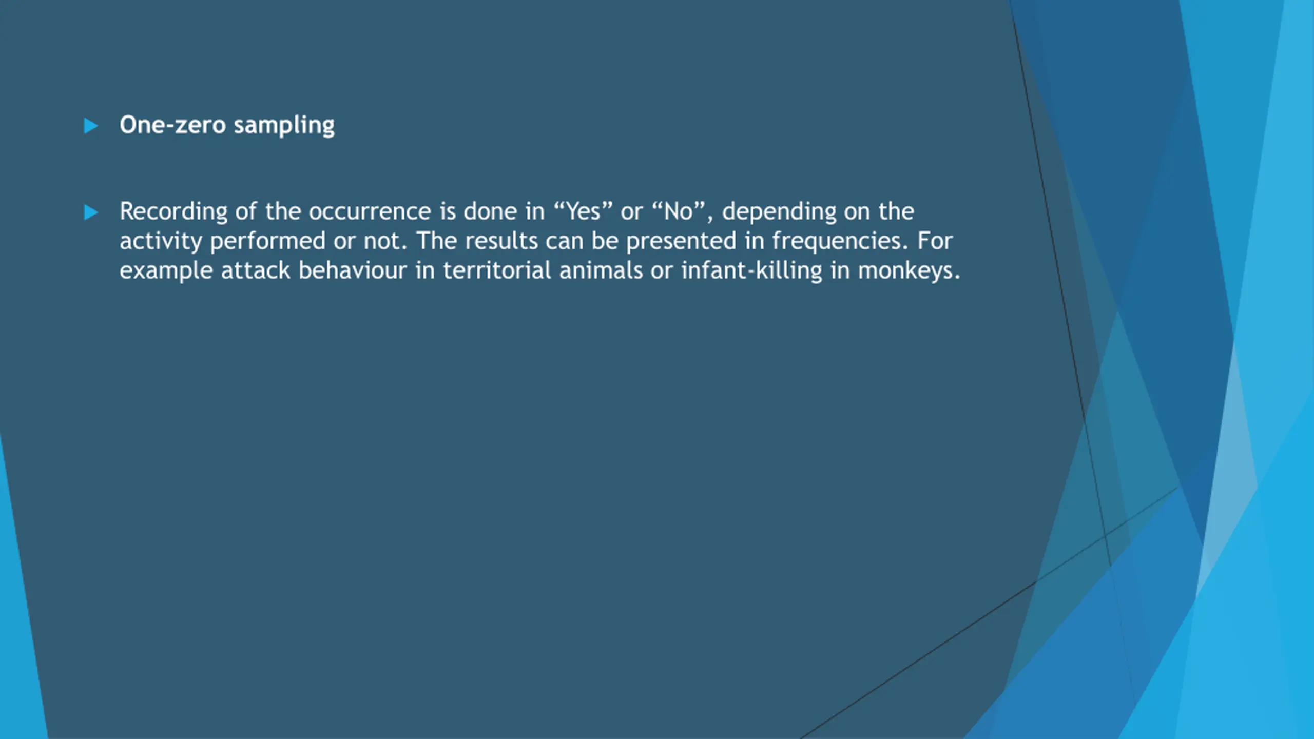 One-zero sampling Recording of the occurrence is done in Yes or No , depending on the activity performed or not. The results can be presented in frequencies. For example attack behaviour in territorial animals or infant-killing in monkeys.