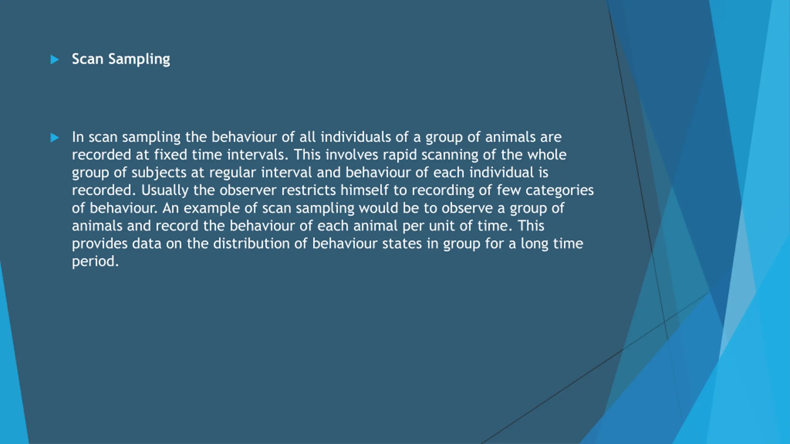 Scan Sampling In scan sampling the behaviour of all individuals of a group of animals are recorded at fixed time intervals. This involves rapid scanning of the whole group of subjects at regular interval and behaviour of each individual is recorded. Usually the observer restricts himself to recording of few categories of behaviour. An example of scan sampling would be to observe a group of animals and record the behaviour of each animal per unit of time. This provides data on the distribution of behaviour states in group for a long time period.
