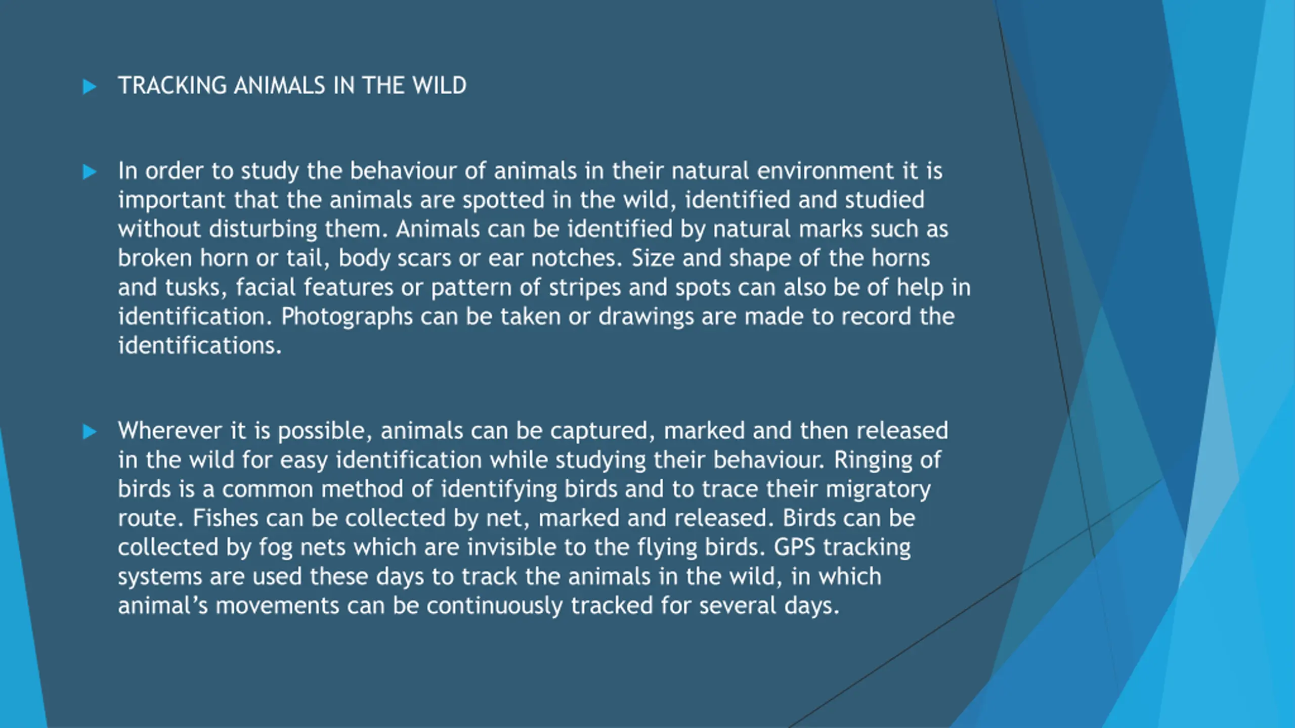 TRACKING ANIMALS IN THE WILD In order to study the behaviour of animals in their natural environment it is important that the animals are spotted in the wild, identified and studied without disturbing them. Animals can be identified by natural marks such as broken horn or tail, body scars or ear notches. Size and shape of the horns and tusks, facial features or pattern of stripes and spots can also be of help in identification. Photographs can be taken or drawings are made to record the identifications. Wherever it is possible, animals can be captured, marked and then released in the wild for easy identification while studying their behaviour. Ringing of birds is a common method of identifying birds and to trace their migratory route. Fishes can be collected by net, marked and released. Birds can be collected by fog nets which are invisible to the flying birds. GPS tracking systems are used these days to track the animals in the wild, in which animal s movements can be continuously tracked for several days.